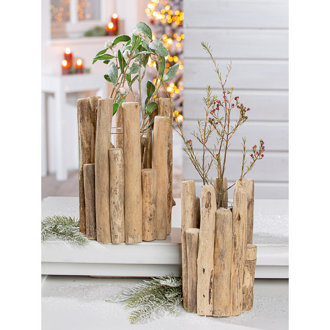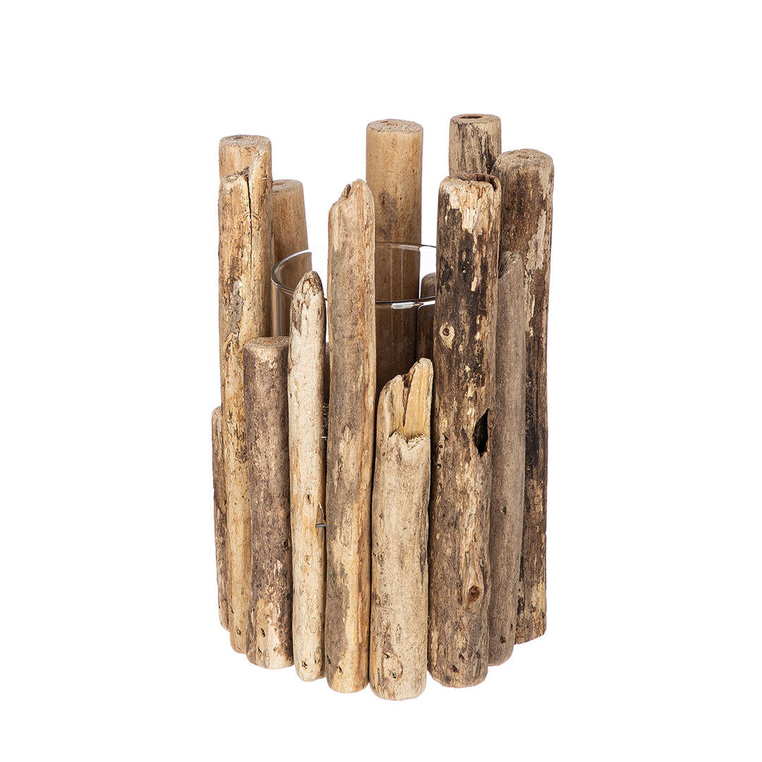 Porta candela Gilde con legnetti verticali naturali e bicchiere interno in vetro trasparente.
