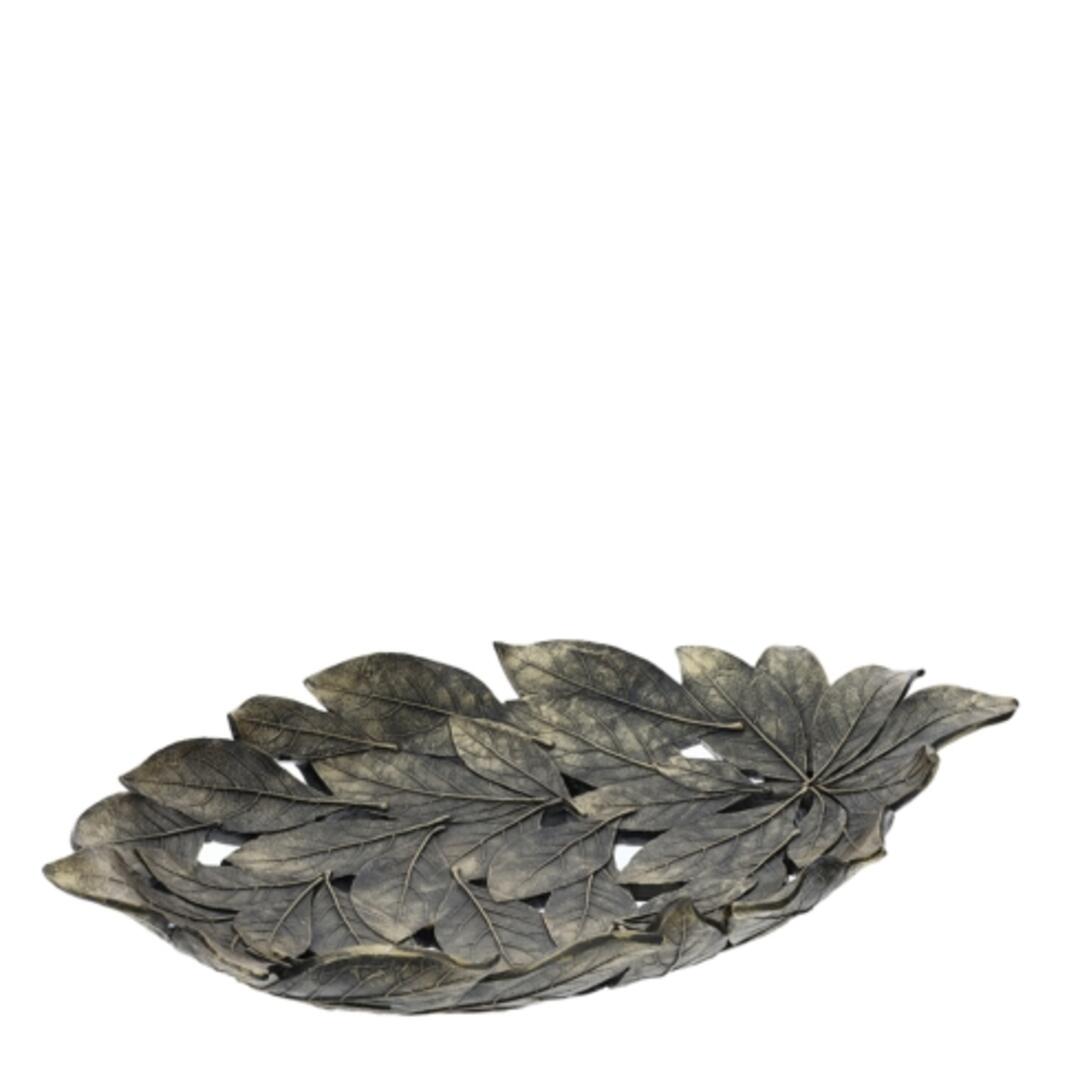 Centrotavola Hervit in poliresina con foglie colore fumè con dettagli dorati, ideale come portaoggetti o piatto decorativo.