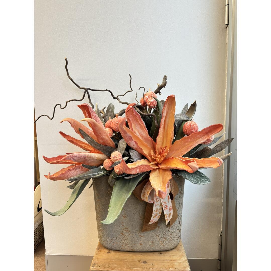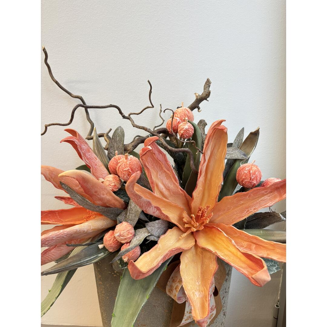 Composizione floreale con fiori in lattice arancio, bacche nella stessa gradazione, rami nocciolo contorto intrecciati finitura naturale, foglie allungate in lattice e foglioline nei toni del verde, e nastri in gradazione in vaso alto ovale dalla particolare finitura colore champagne.