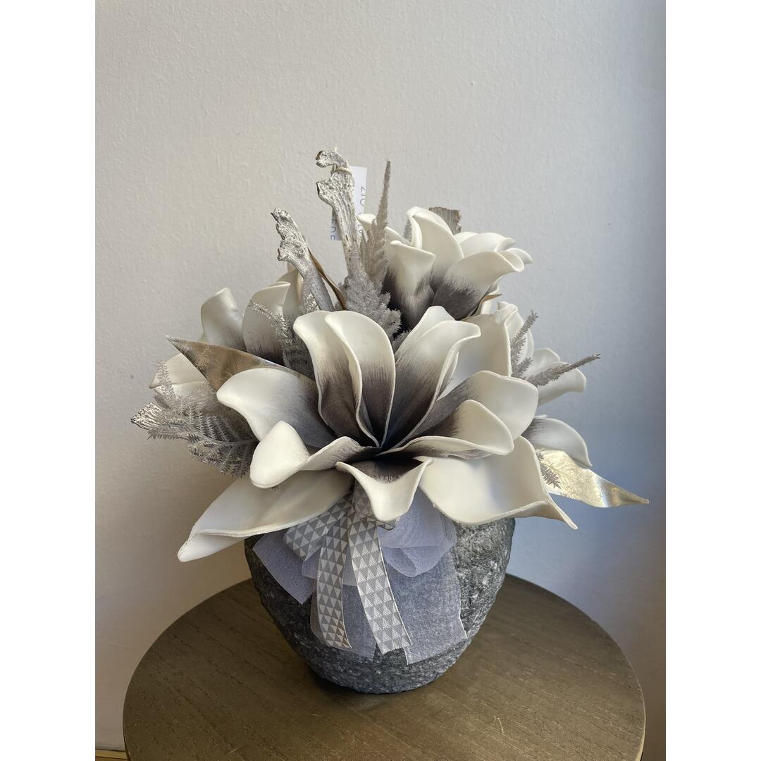 Composizione floreale con fiori in lattice grigi/bianchi sfumati, rametti sbiancati, foglie in lattice bianche, foglioline silver e nastri in gradazione in cache pot in ceramica colore antracite finitura opaca effetto pietra.
