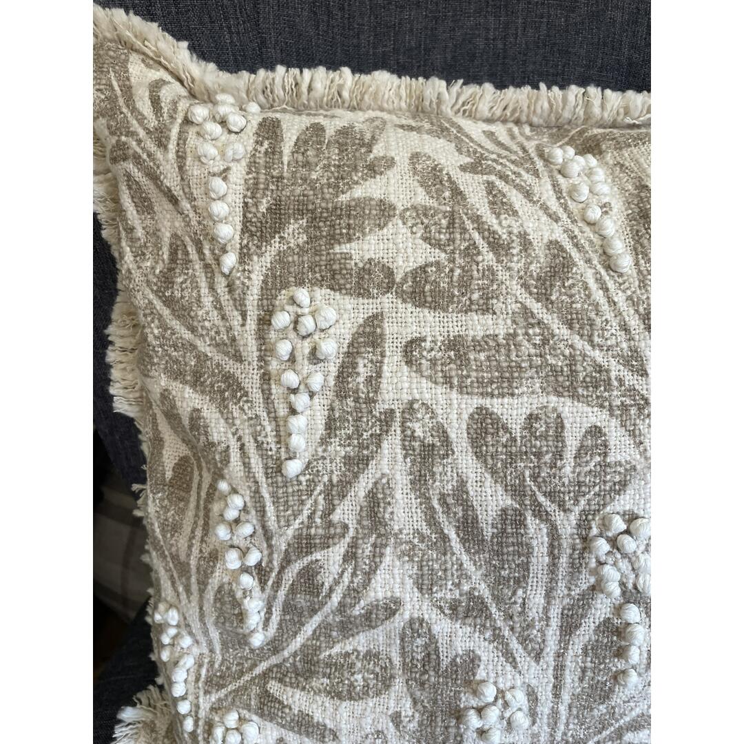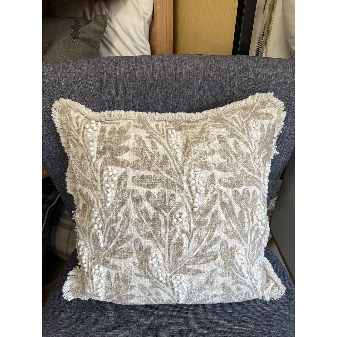 Cuscino Innovaliving Leafy Natural quadrato in 100% cotone colore marrone/naturale con stampa decoro foglie, parti in rilievo e frangette.
