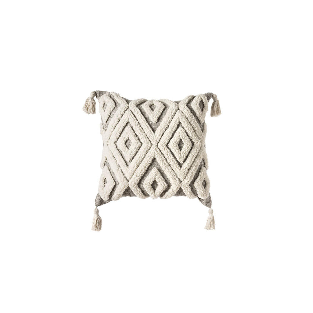 Cuscino L'Arte di Nacchi quadrato in cotone e velluto di viscosa base colore grigio con lavorazione geometrica in rilievo bianca e nappine sugli angoli.
