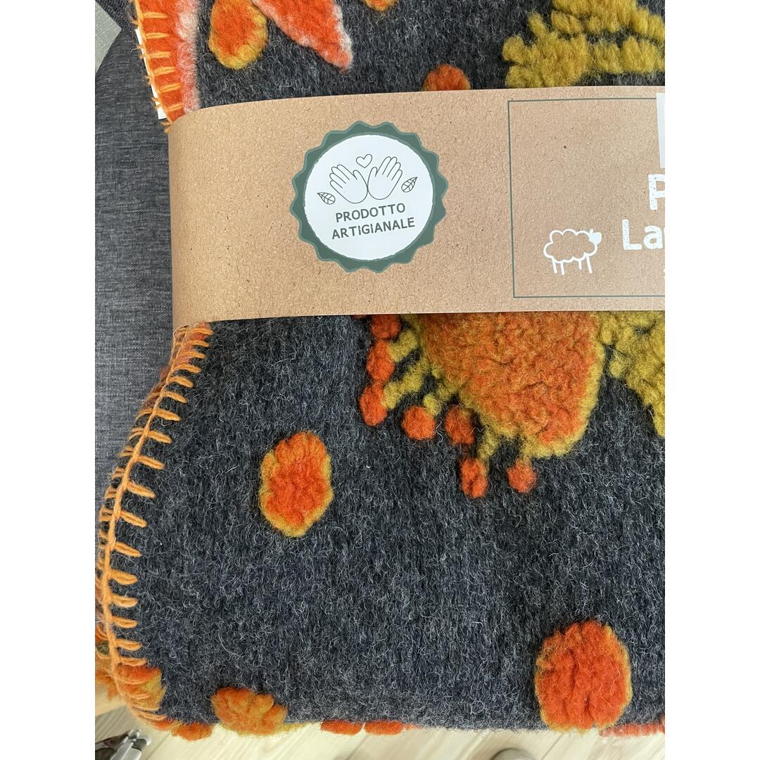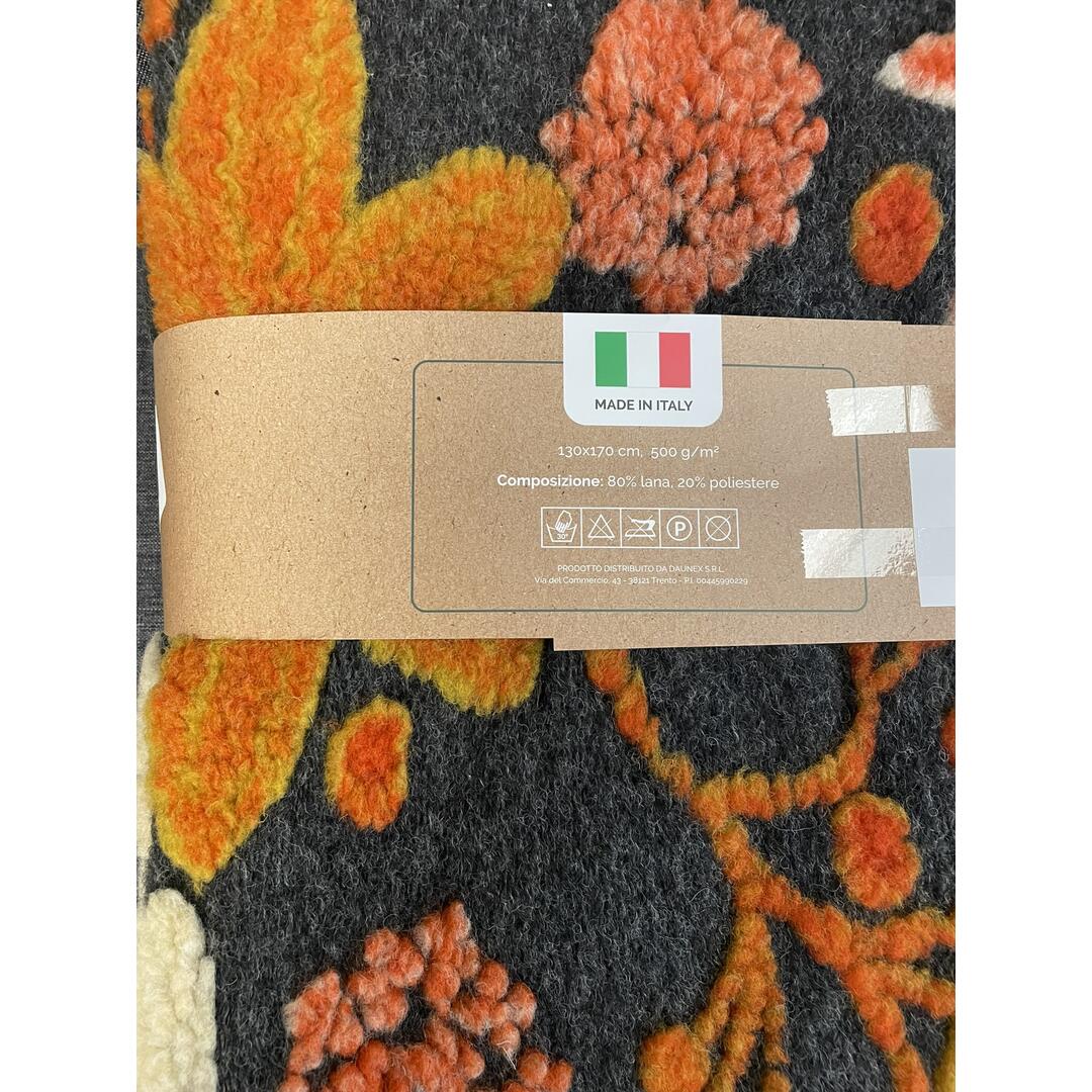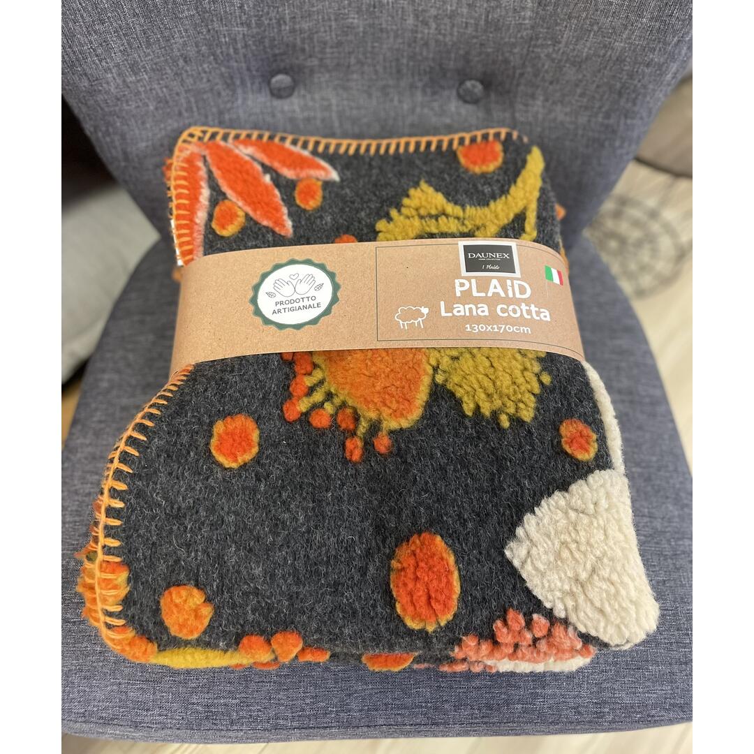 Plaid Daunex in lana cotta decoro floreale colori arancio/ocra/beige su base grigia.
