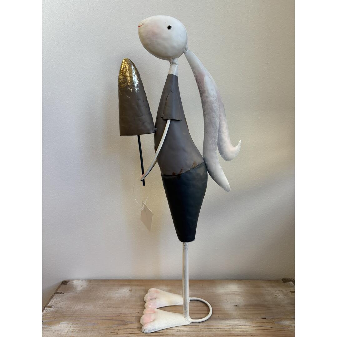 Coniglietto maschio Stile Nordico in metallo con vestiti sui toni del grigio e fiore in mano.