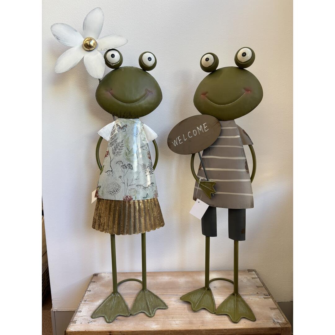 Rana Stile Nordico in metallo colore verde, con maglietta tortora decoro righe bianche e scritta Welcome.