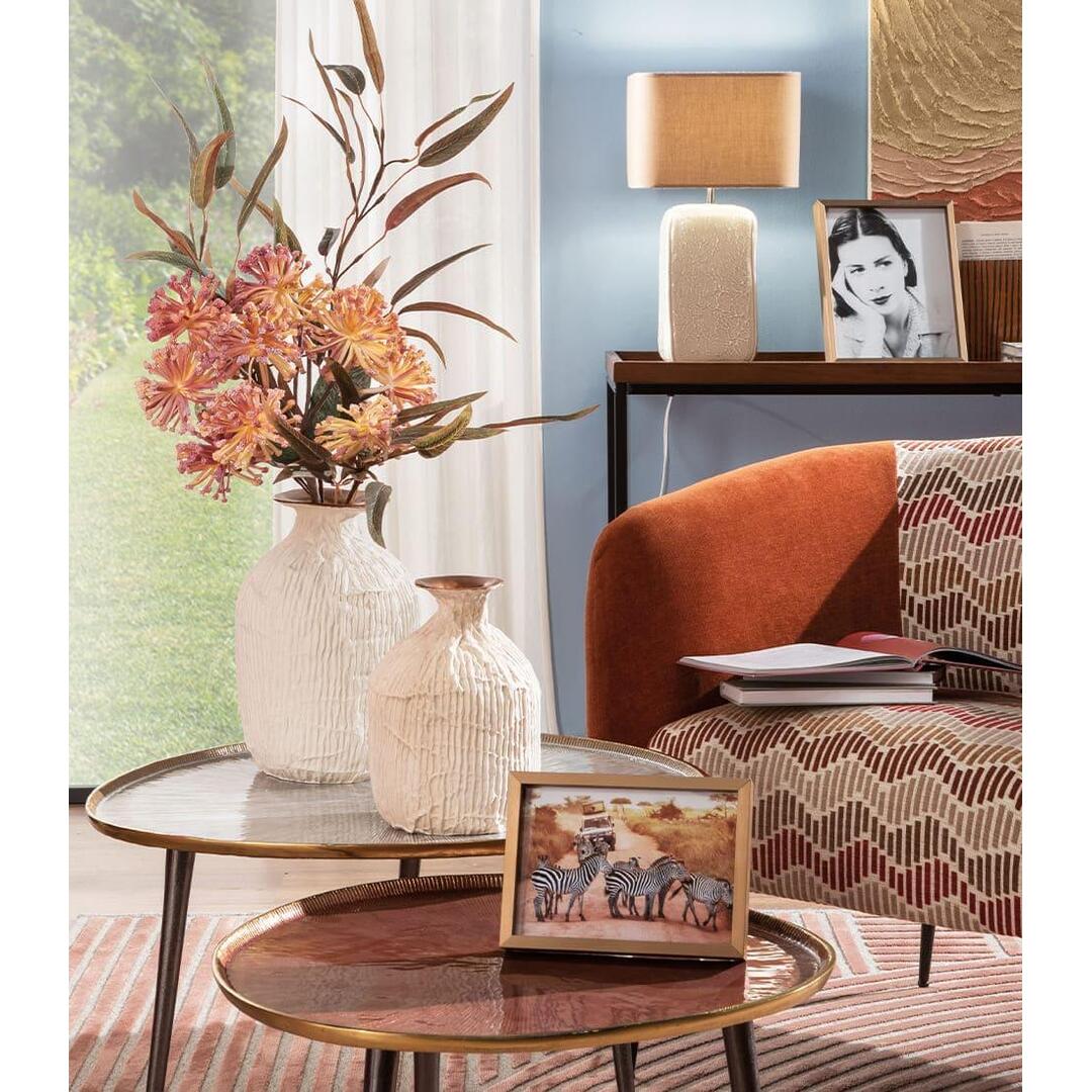 Lampada Oca Nera da tavolo in ceramica con paralume in tessuto per un effetto materico unico che si ispira alle nervature naturali.