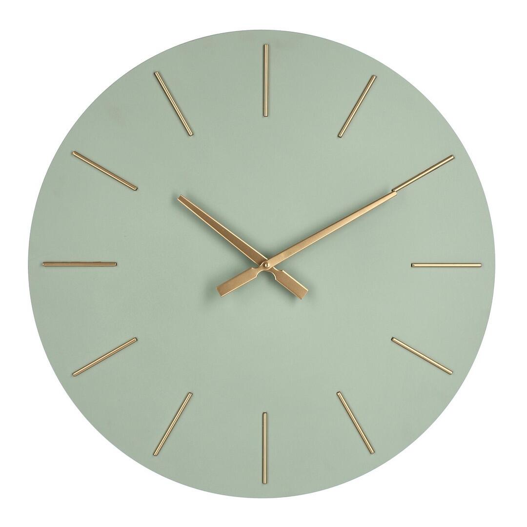Orologio Bizzotto Timeline in legno mdf colore verde salvia con lancette e indici in metallo finitura oro opaco.