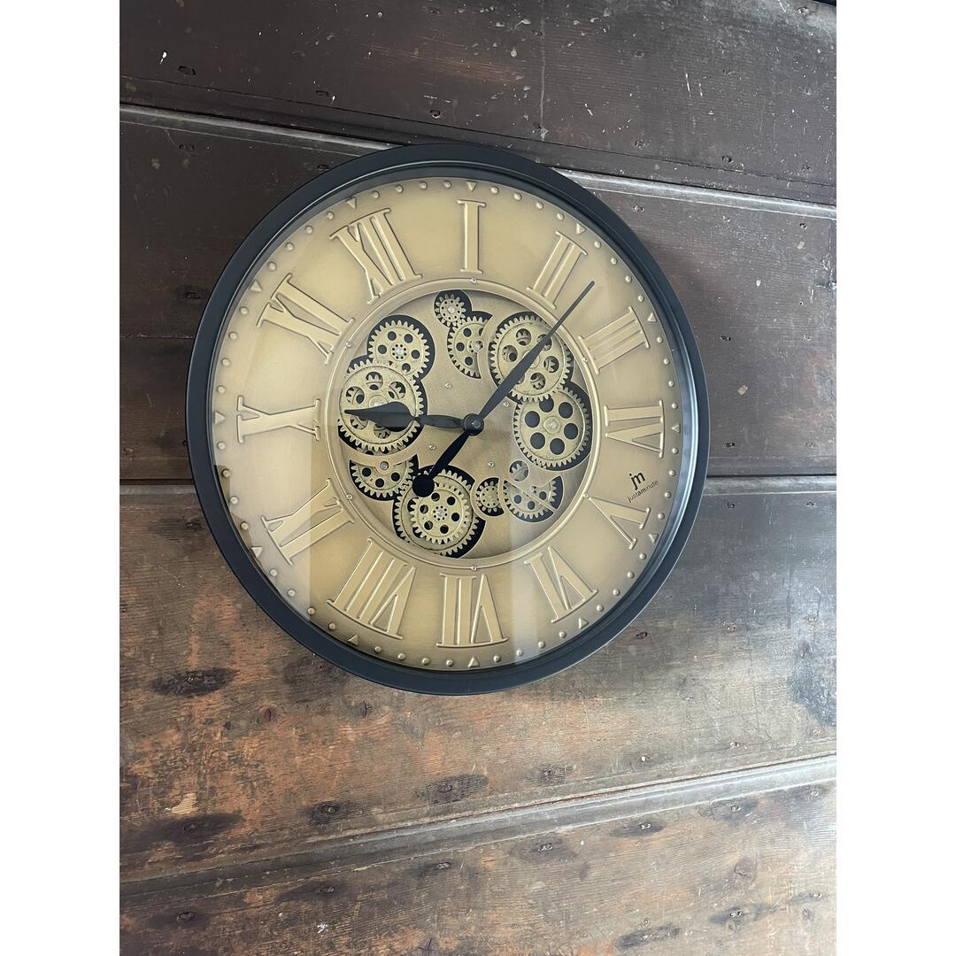 Orologio da parete Lowell rotondo con quadrante nero opaco e cassa in vetro trasparente con interno metallo oro anticato e ingranaggi a vista