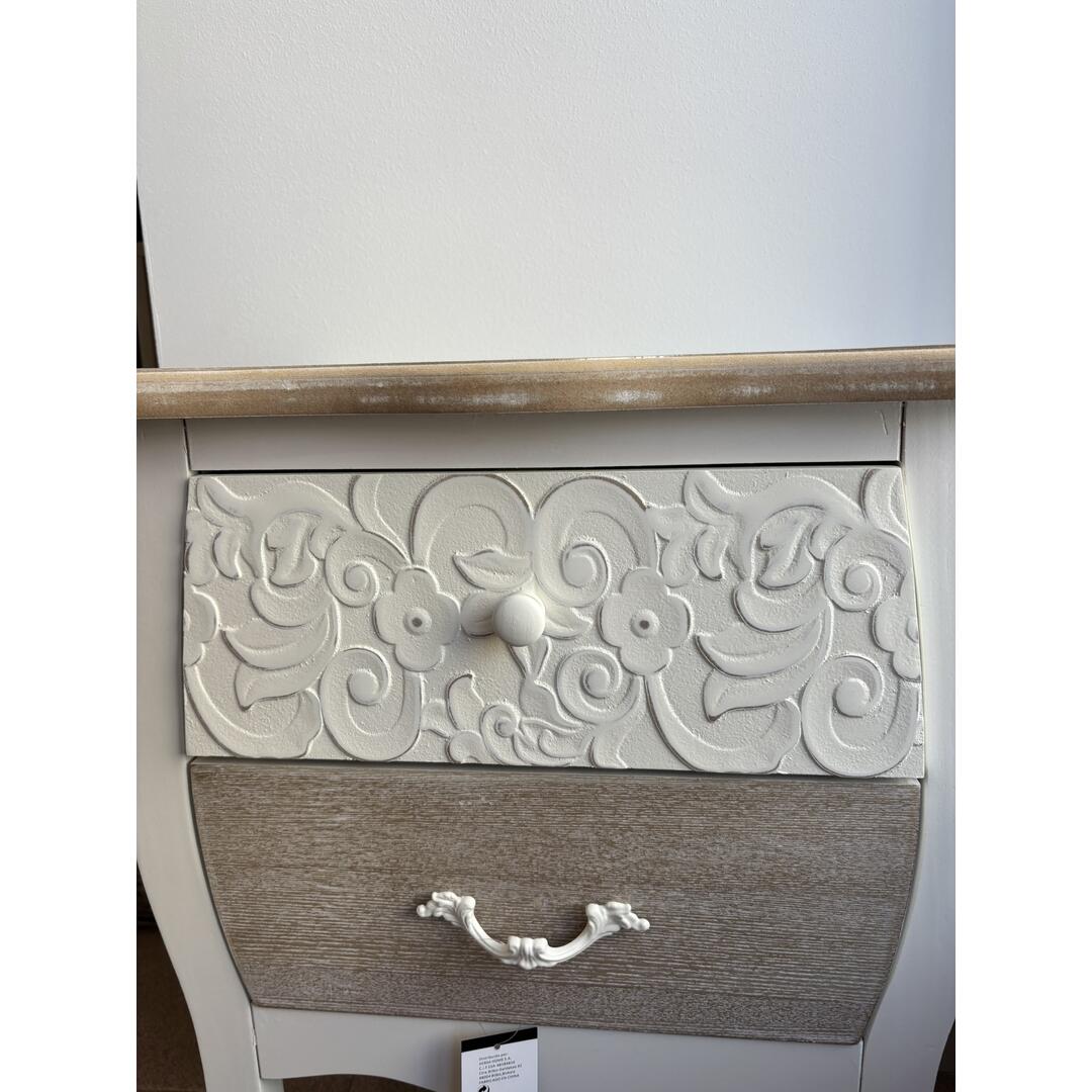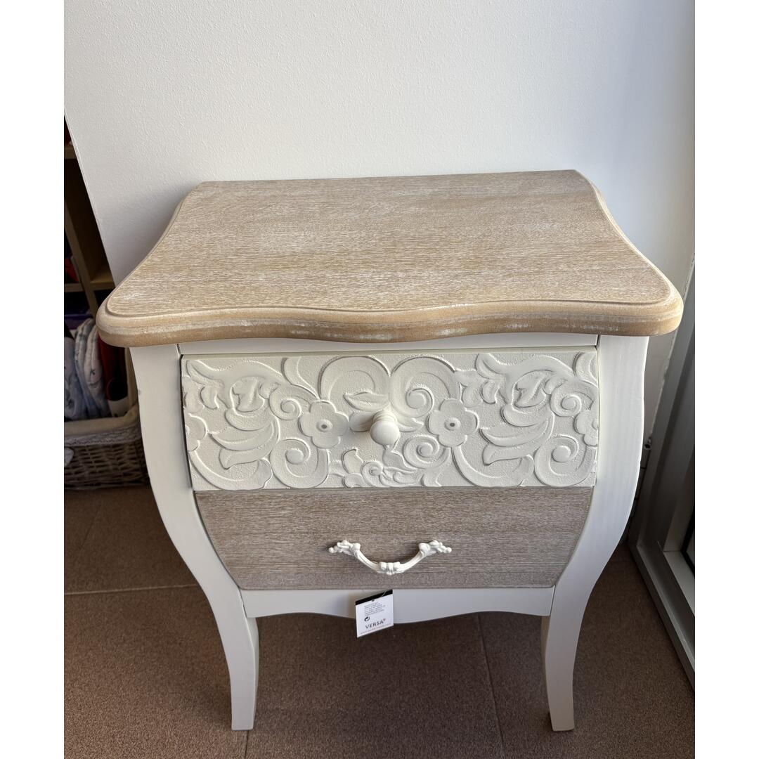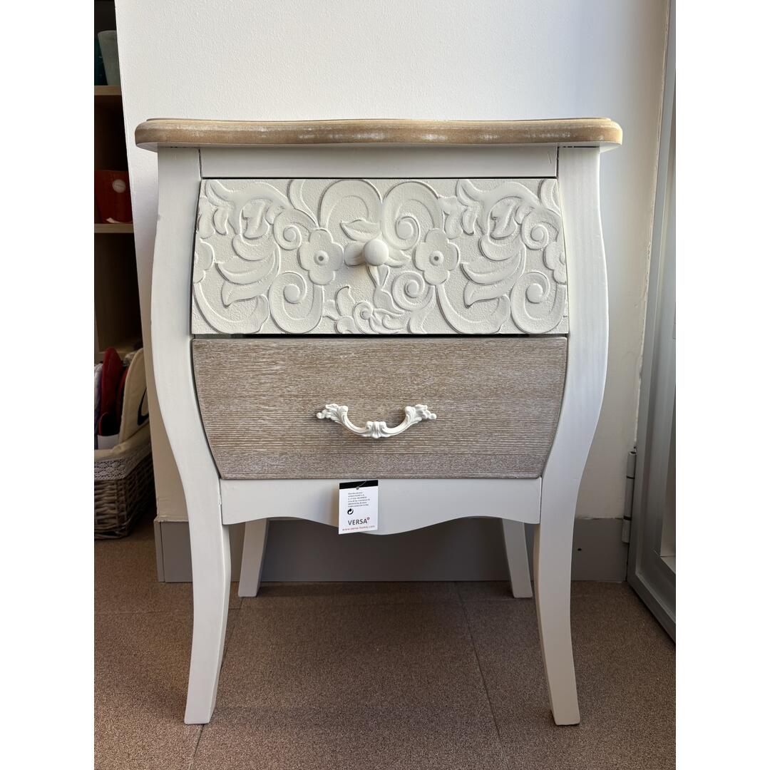 Comodino 2 cassetti Versa Rustico, realizzato in legno di pino e MDF finitura naturale, dalla struttura robusta e un design accogliente, con un elegante colore bianco che si integra facilmente in vari stili decorativi.