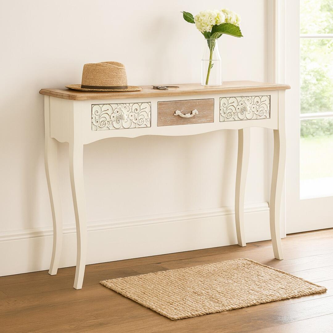 Consolle Versa Rustico con 3 cassetti realizzata in legno MDF e pino finitura naturale e bianca, dal design accogliente che si integra perfettamente in contesti sia tradizionali che moderni; è un complemento d'arredo versatile e funzionale, ideale per ingressi e corridoi.