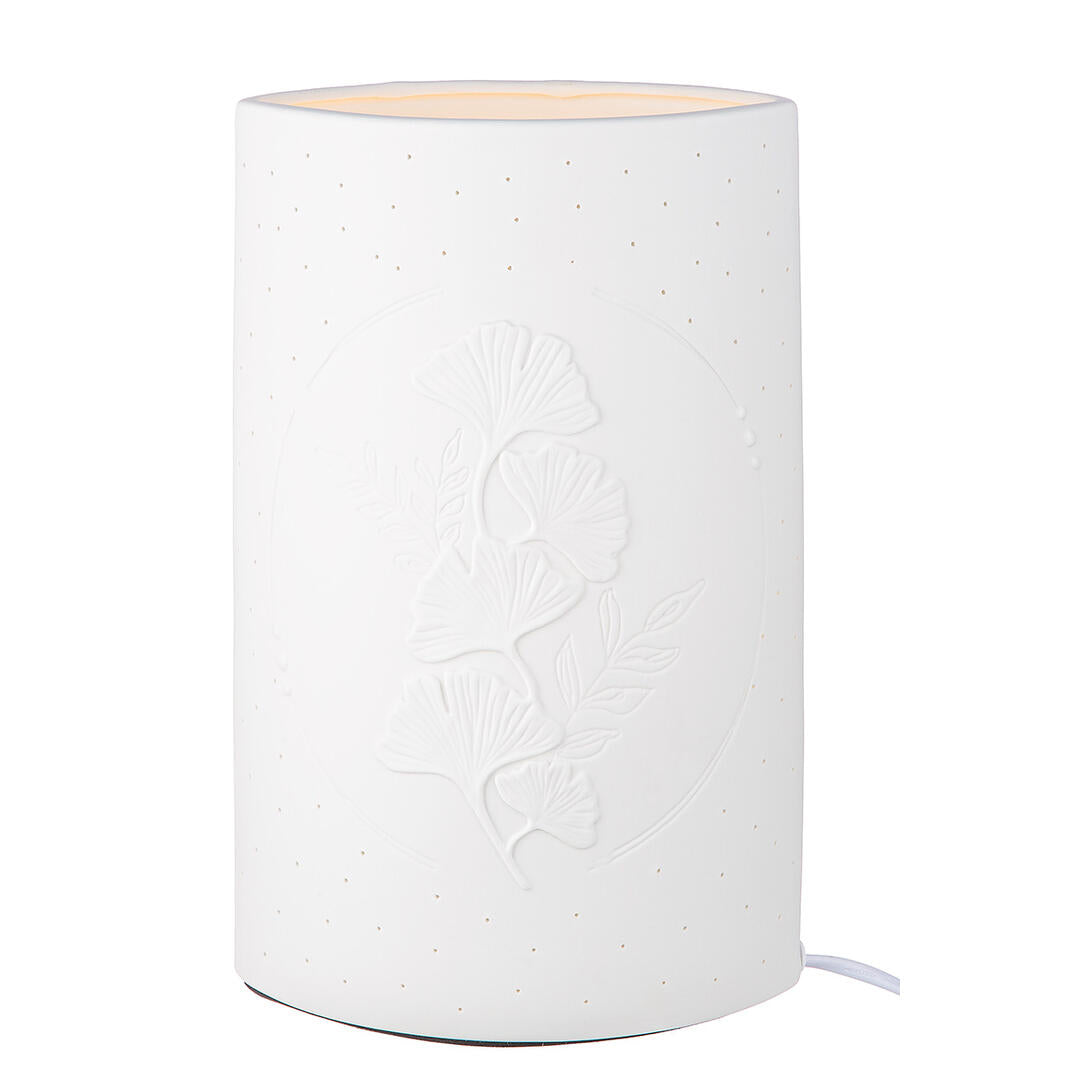 Lampada da tavolo Gilde forma ellisse in porcellana traforata finitura bianco opaco con decoro foglie ginkgo
