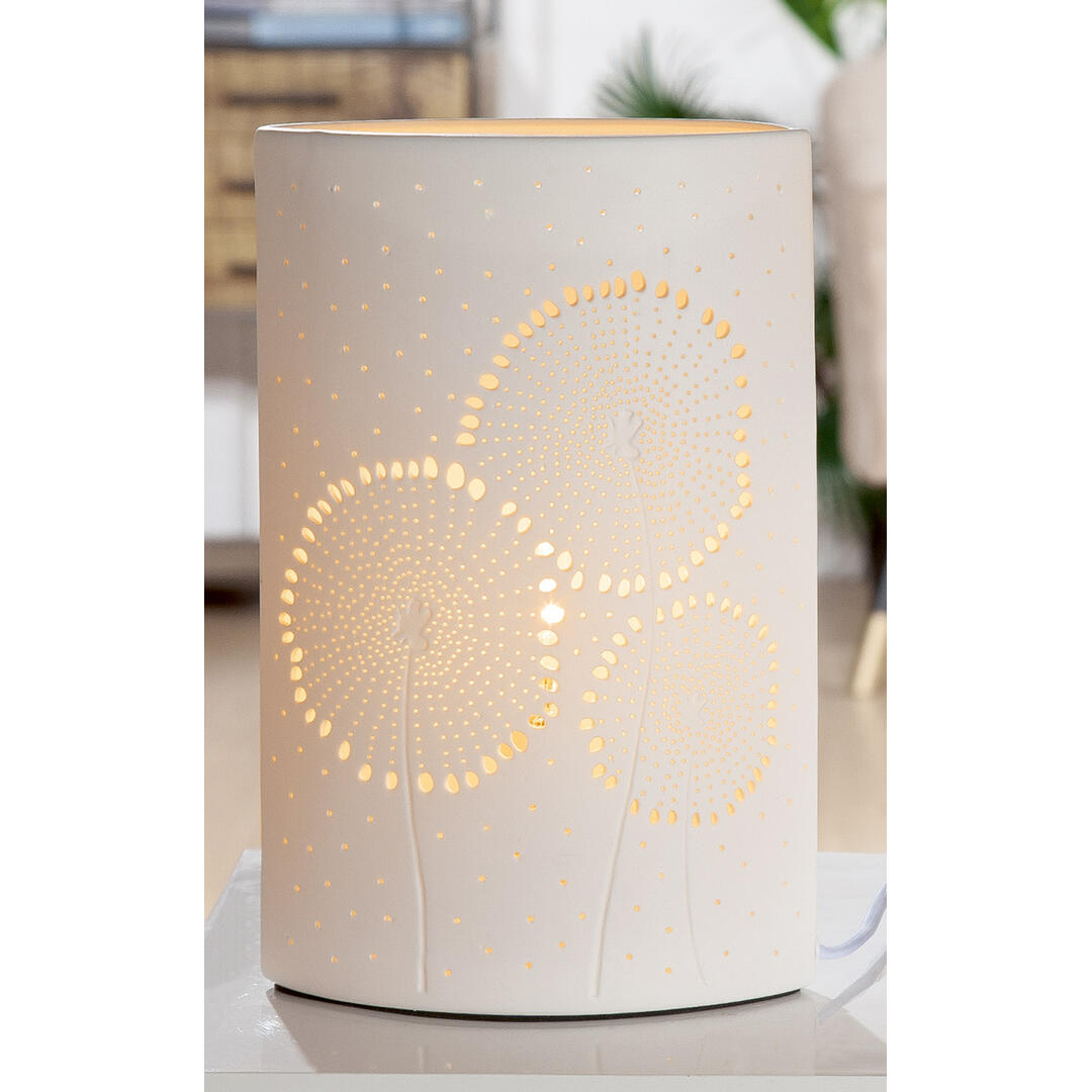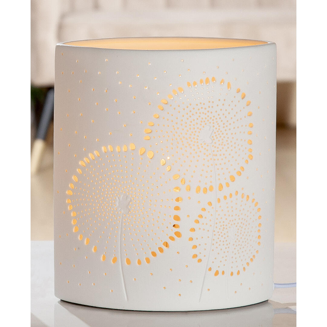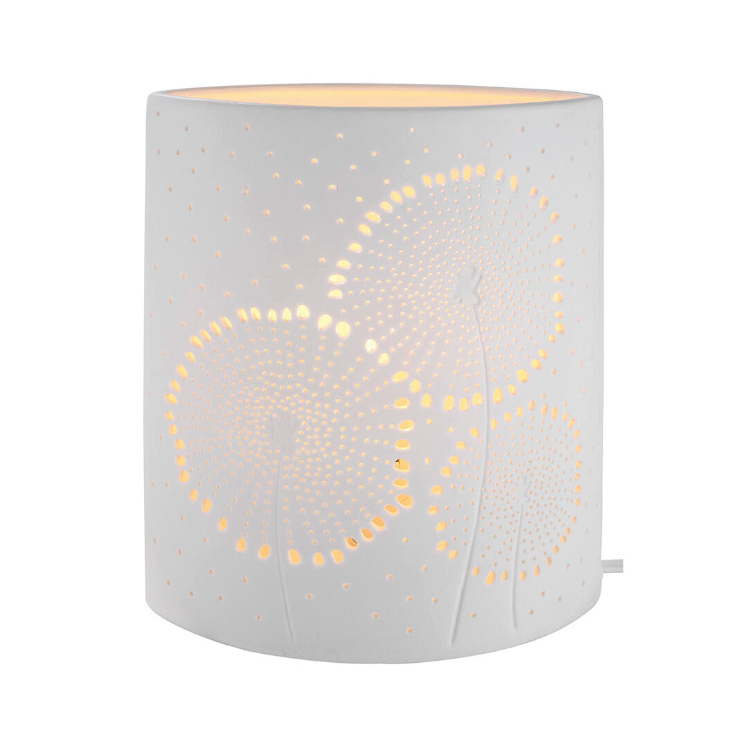 Lampada da tavolo Gilde forma ellisse in porcellana traforata finitura bianco opaco con decoro soffioni