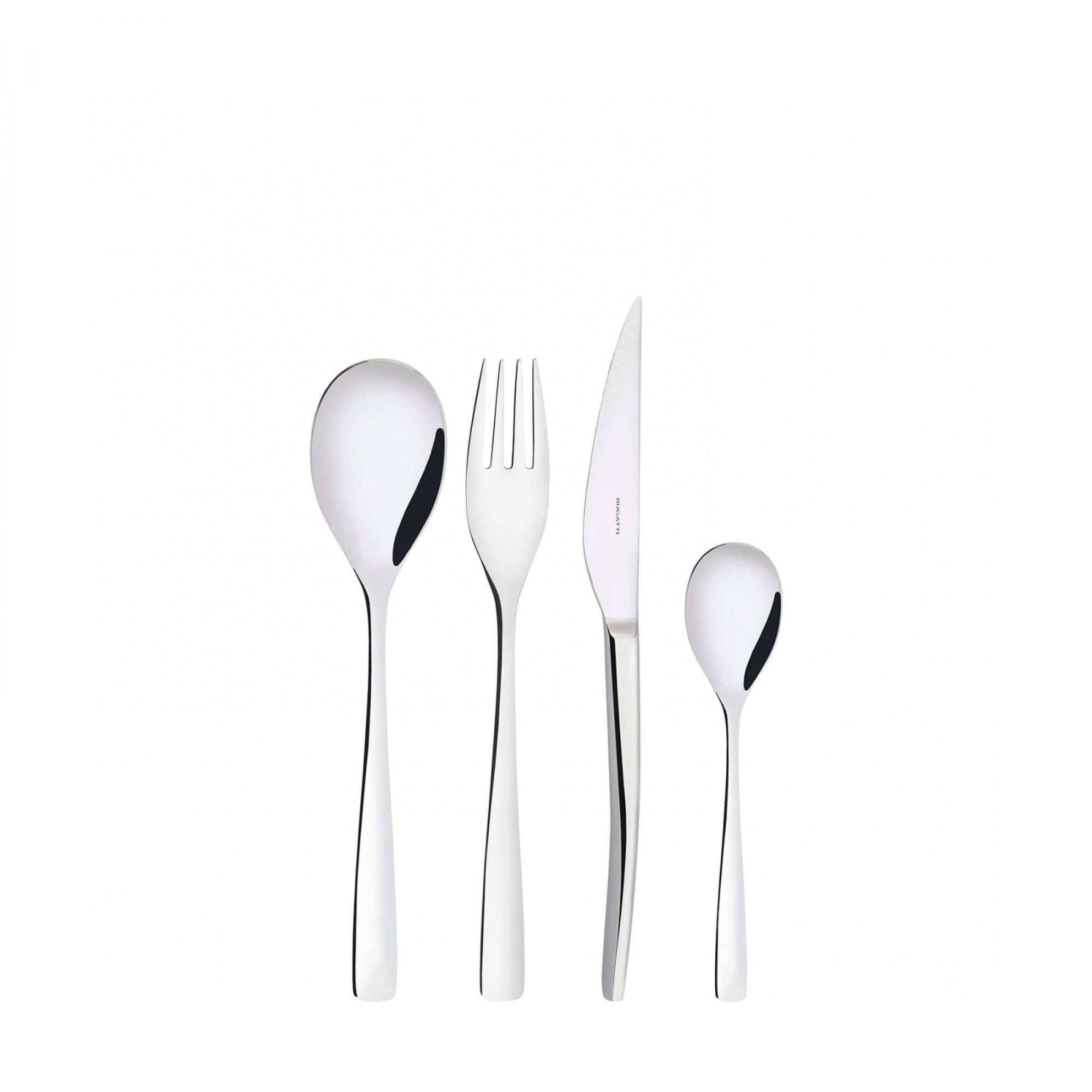 Servizio posate Bugatti Amalfi in acciaio inox inossidabile 18/10 dalle forme morbide e arrotondate. Ispirata al fascino del panorama di Amalfi, costituisce un servizio dallo stile minimale da integrare alla tua mise en place sia nelle occasioni speciali che nei tuoi momenti quotidiani. Il coltello è forgiato monoblocco e resta in appoggio sulla lama.