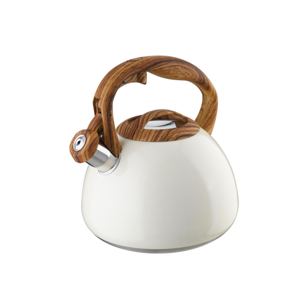 Bollitore a fischio Eva in acciaio inox smaltato colore bianco con manico in ABS tipo legno.