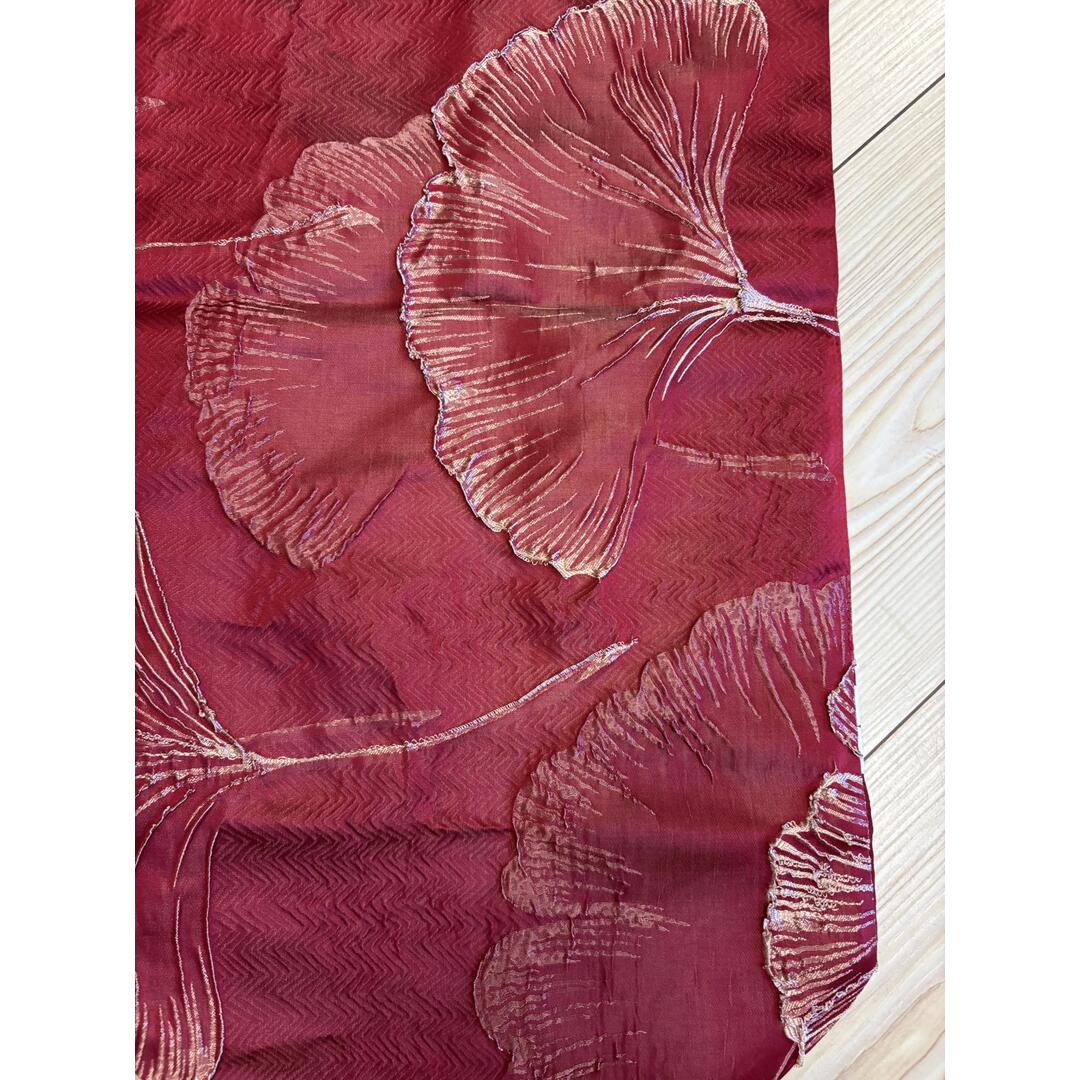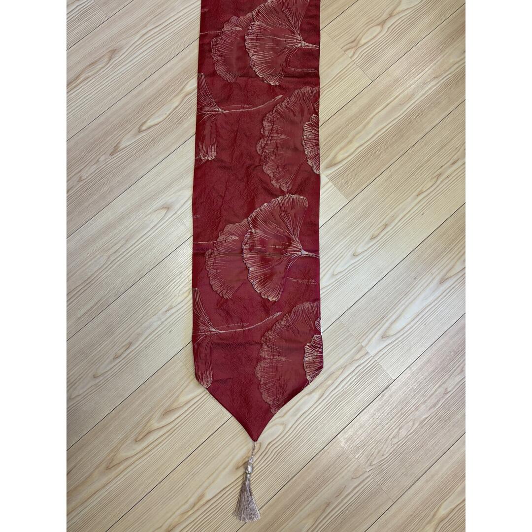 Runner Hervit in poliestere colore rosso decoro dorato foglie di ginko in rilievo con nappine ai due lati.