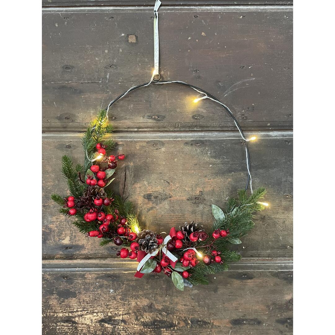Anello fuoriporta natalizio in metallo nero opaco con decorazione finto pino, bacche rosse, pignette, luci a led e fiocco in gradazione.