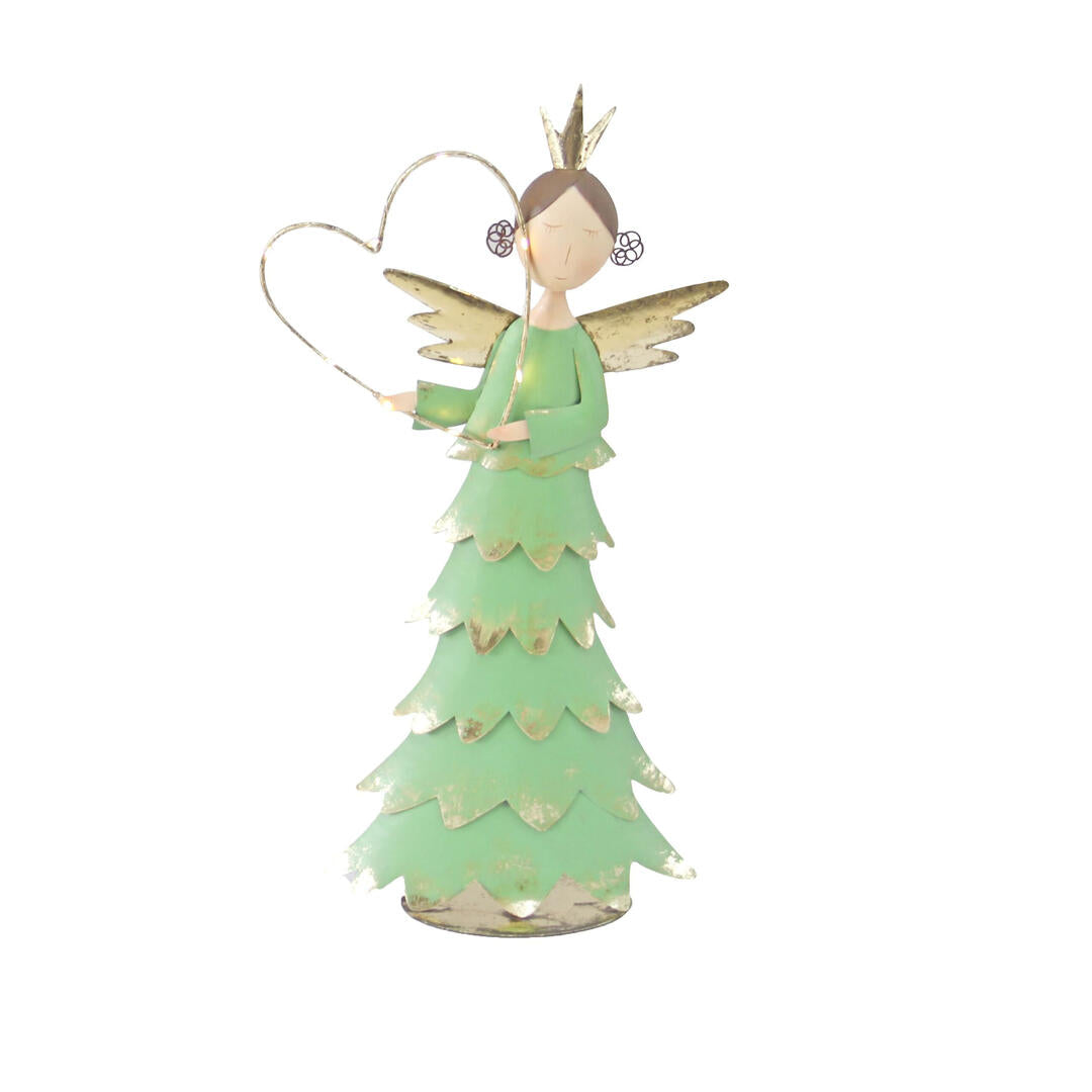 Angelo Elle Gift con cuore con led a batteria, in metallo colore verde con coroncina, ali e dettagli oro.