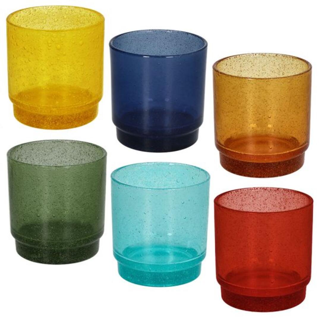 Set 6 bicchieri Andrea Fontebasso Watercolor in vetro, in sei diversi colori assortiti (blu, rosso, arancio, giallo, verde, azzurro), impilabili.