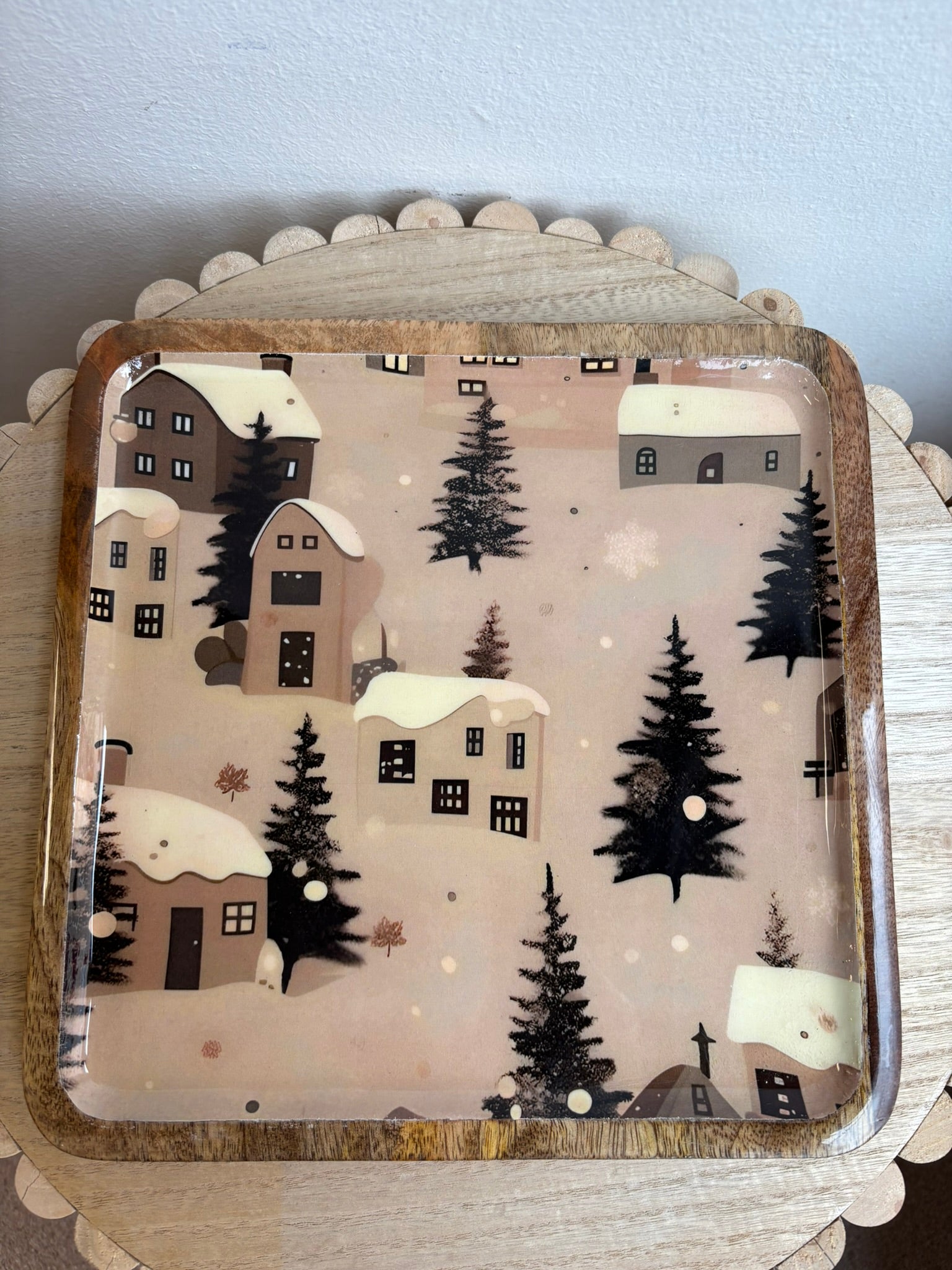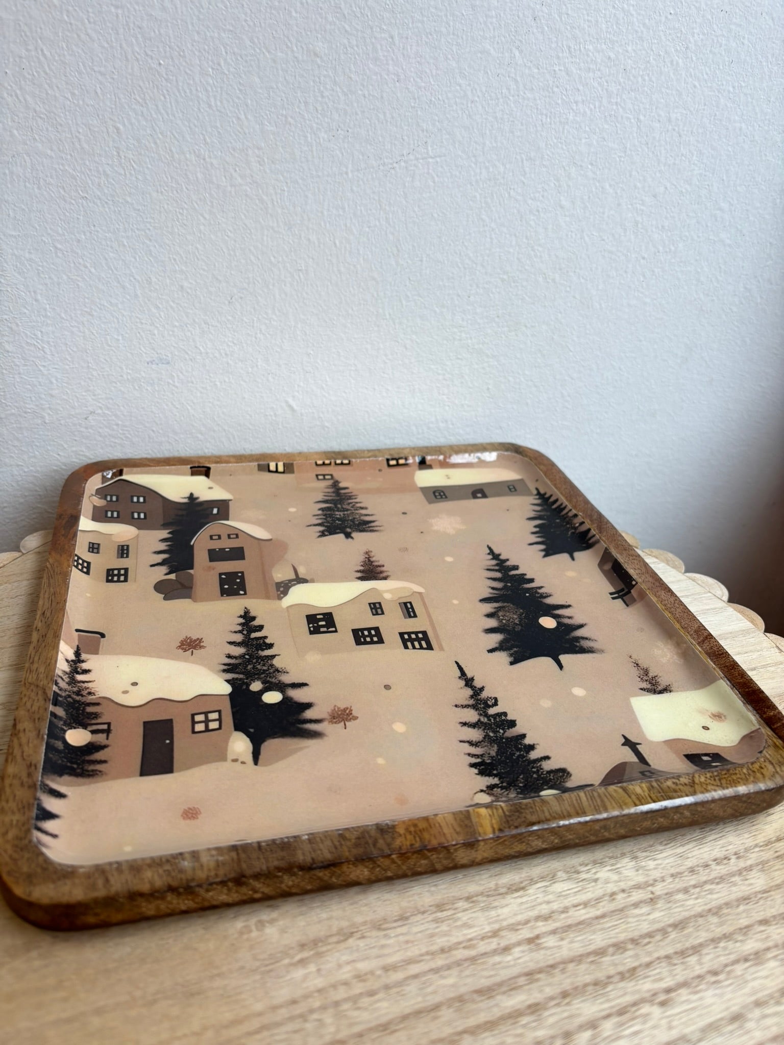 Centrotavola/svuota tasche Innovaliving Mountain quadrato in legno di mango con decoro laccato lucido casette e pini colori marron/beige/verde bosco