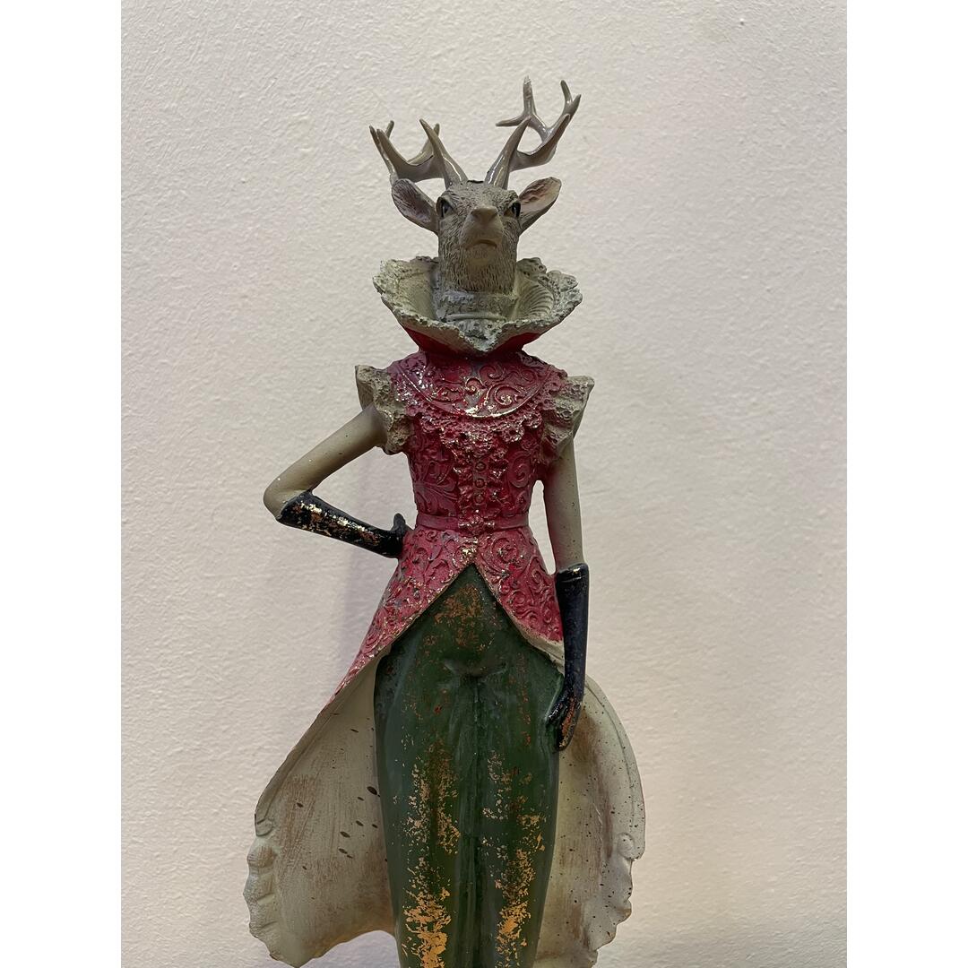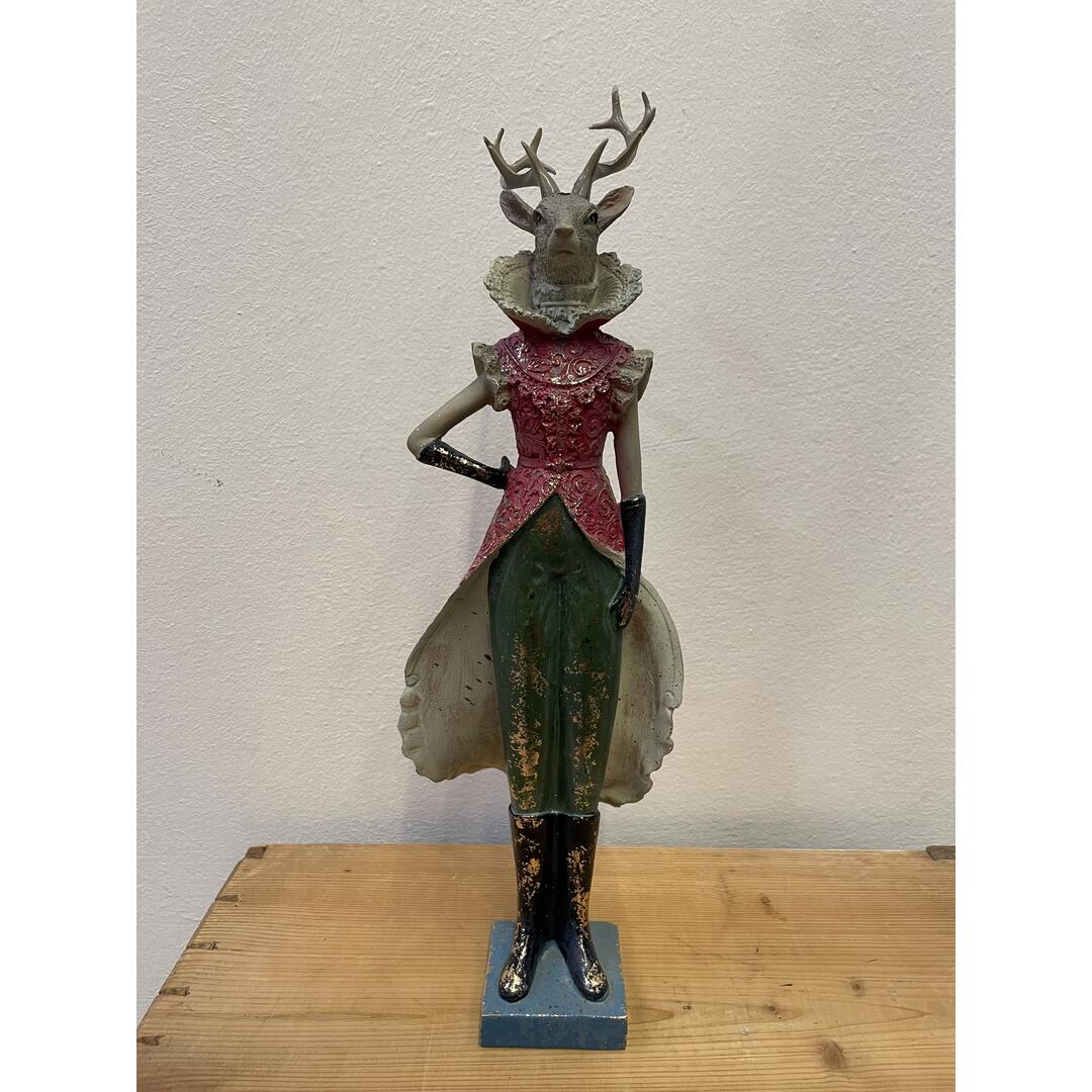 Cerva Hervit Ancient Wood in poliresina con mantello bordeaux, pantaloni verdi, stivali e guanti neri, con eleganti dettagli dorati.