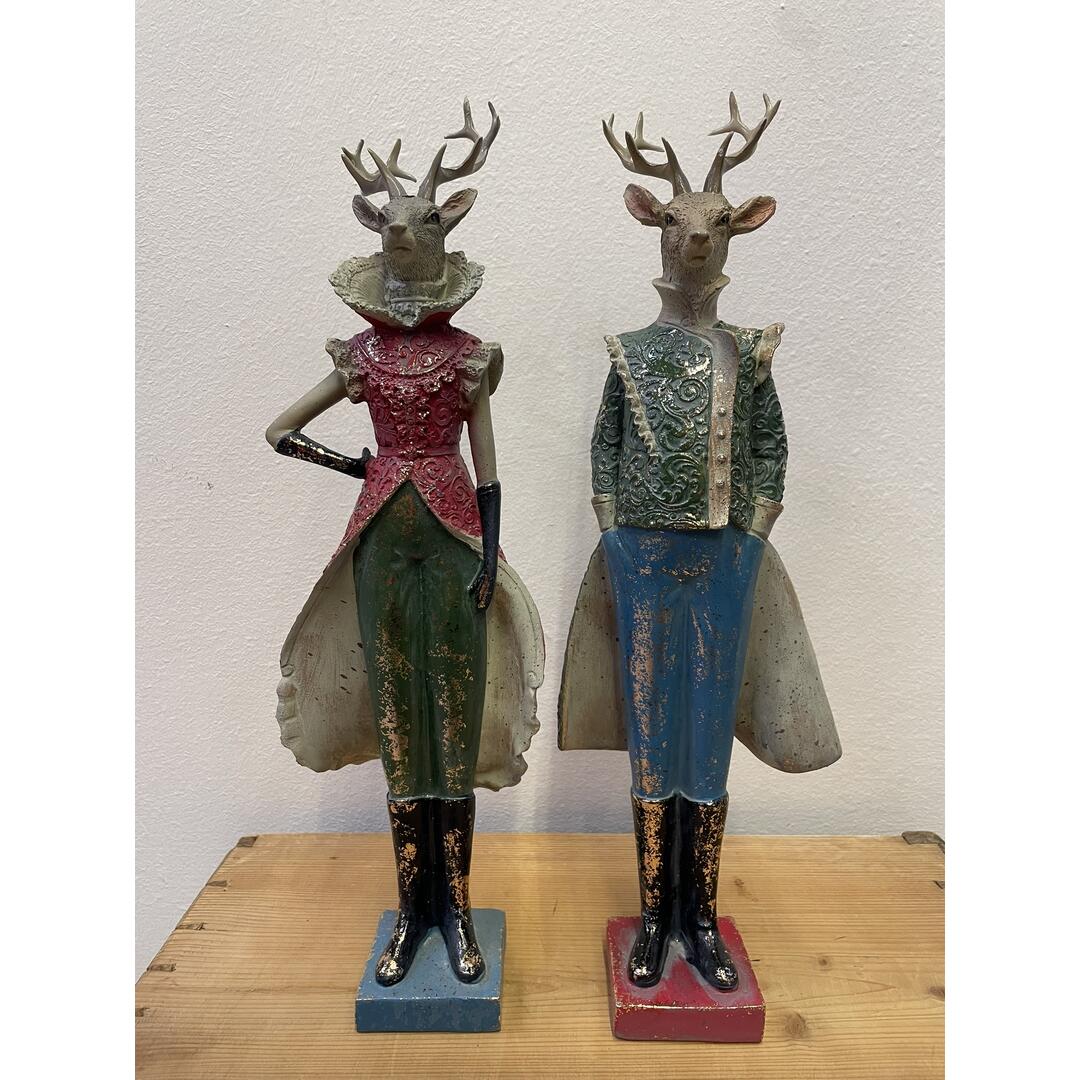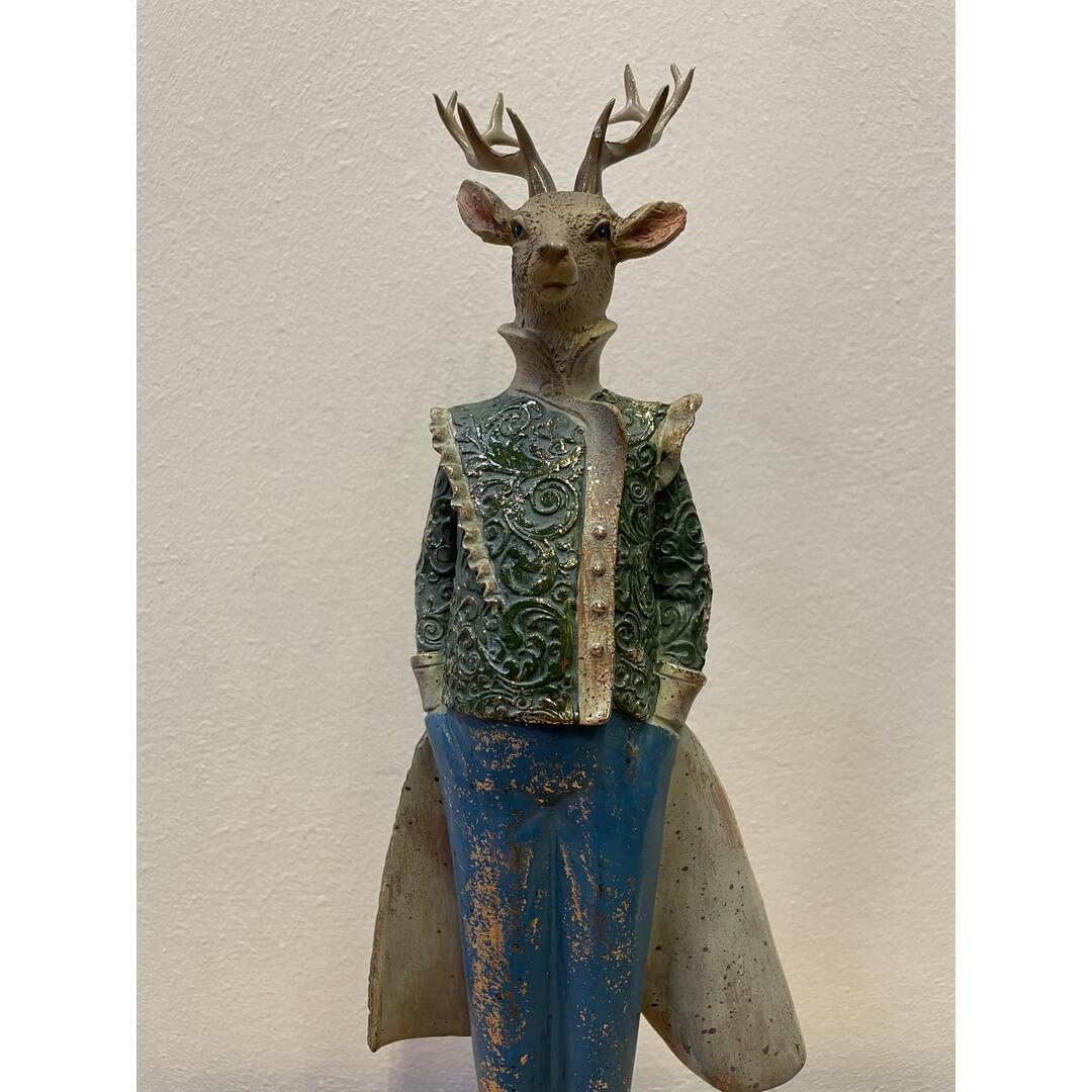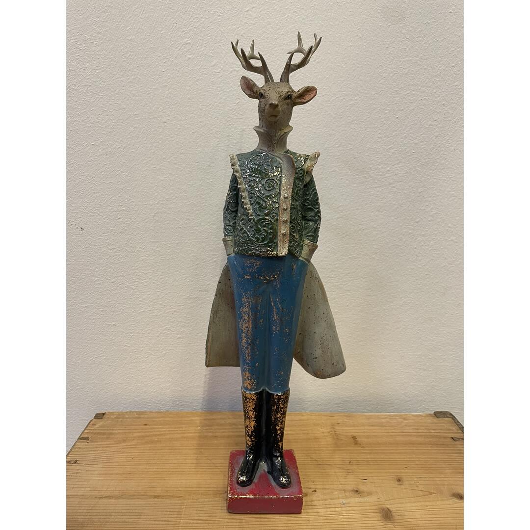 Cervo Hervit Ancient Wood in poliresina con giacca allungata verde, pantaloni blu e stivali neri, con eleganti dettagli dorati.