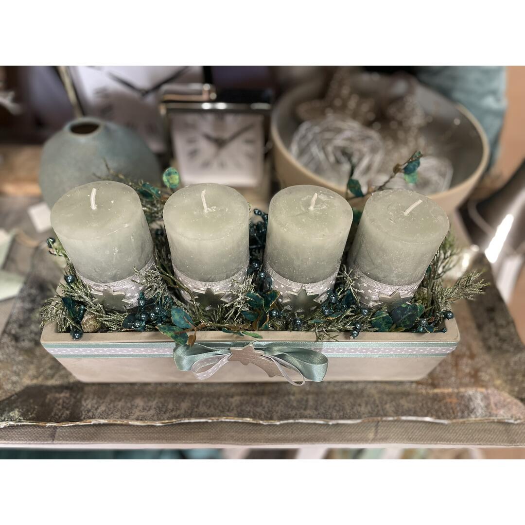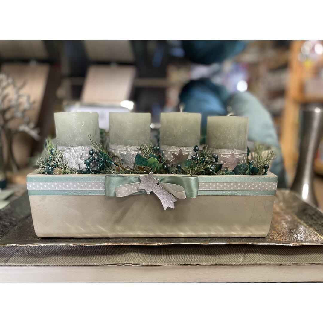 Composizione corona d'avvento con candele cilindriche colore verde, finto pino effetto ghiacciato, foglie e rametti verde petrolio, nastri e fiocco tiffany/grigio con stelline argento in vaschetta rettangolare cemento.