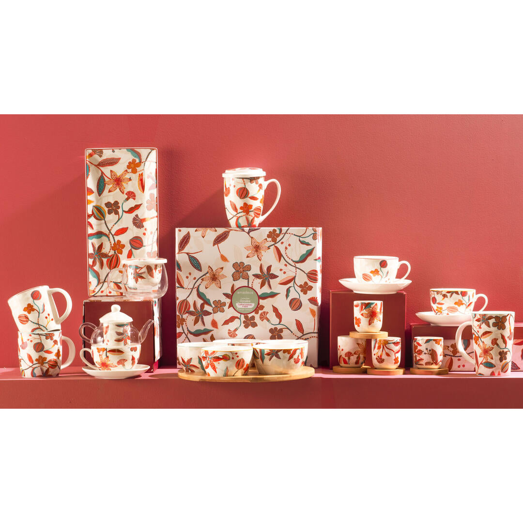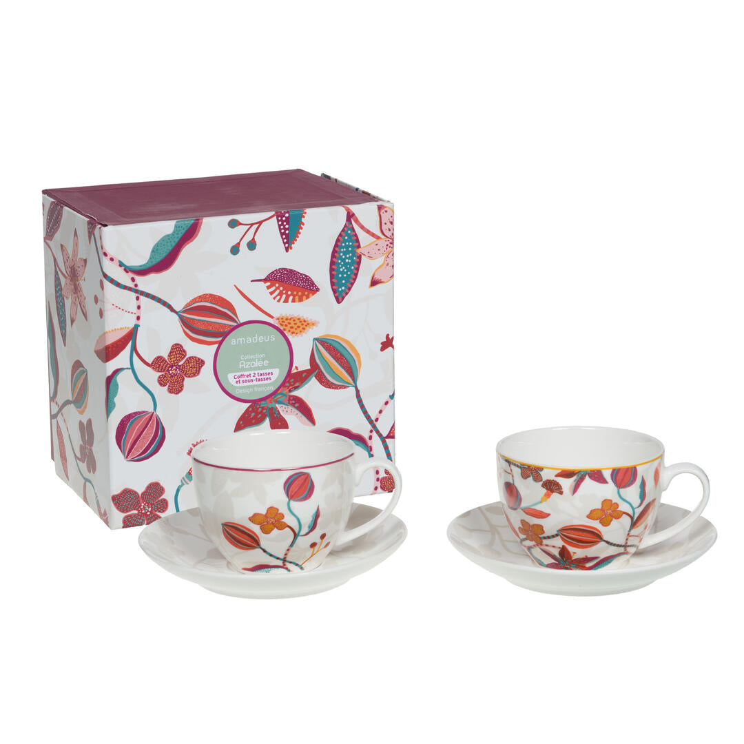 Confezione 2 tazze thè/cappuccino Cades Azalea in porcellana New Bone China bianca con elegante e colorato decoro floreale, con piattino. La porcellana fine offre una presa piacevole ed un aspetto sofisticato, perfetto per gustare caffè o thè.