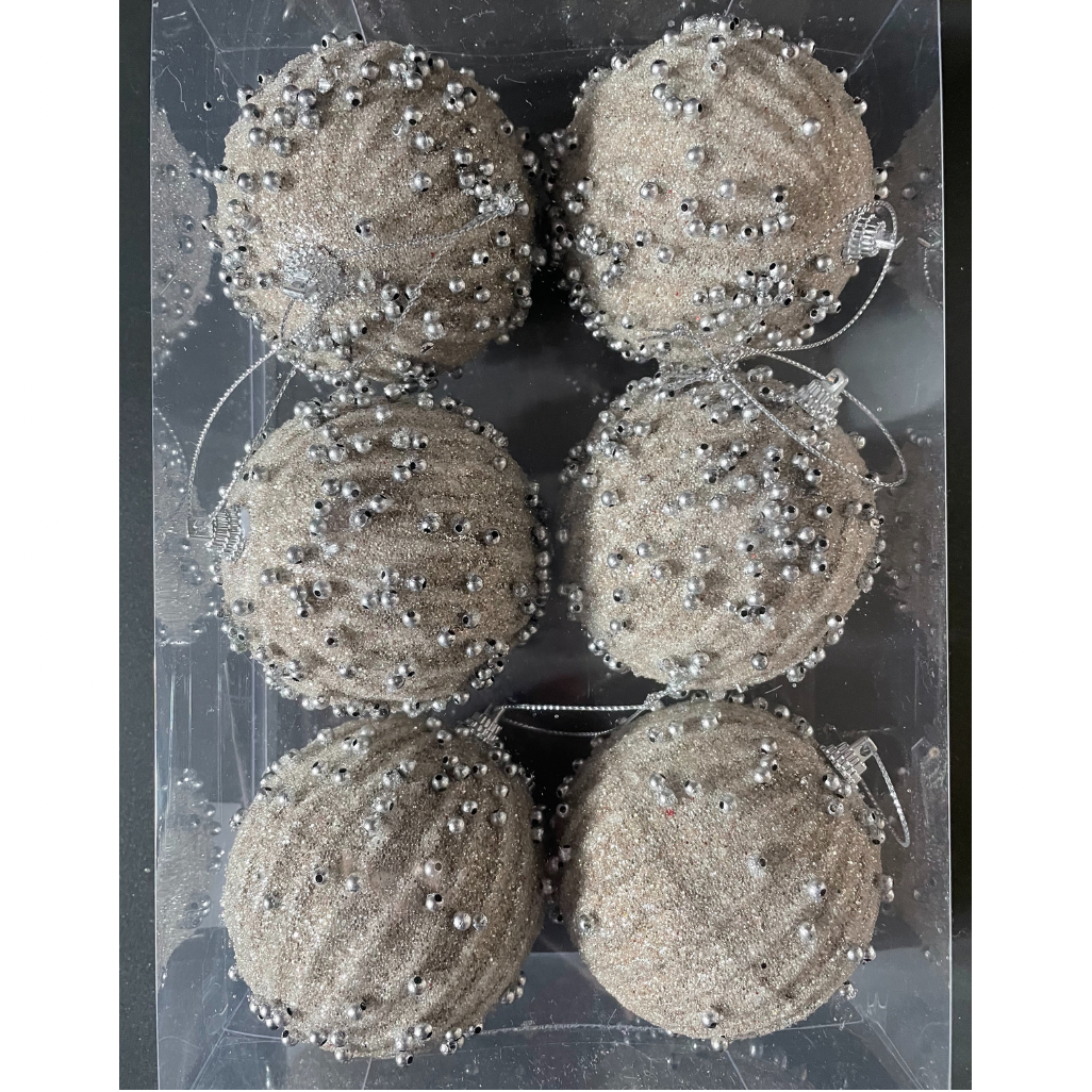Confezione 6 pezzi pallina Natale in plastica colore champagne effetto brillantinato con decoro perline argento