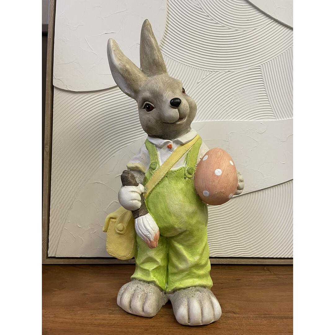 Coniglietto maxi maschio Nuvole di Stoffa in ceramica con completo verde giallo, borsa a tracolla gialla e uovo con decoro pois in mano
