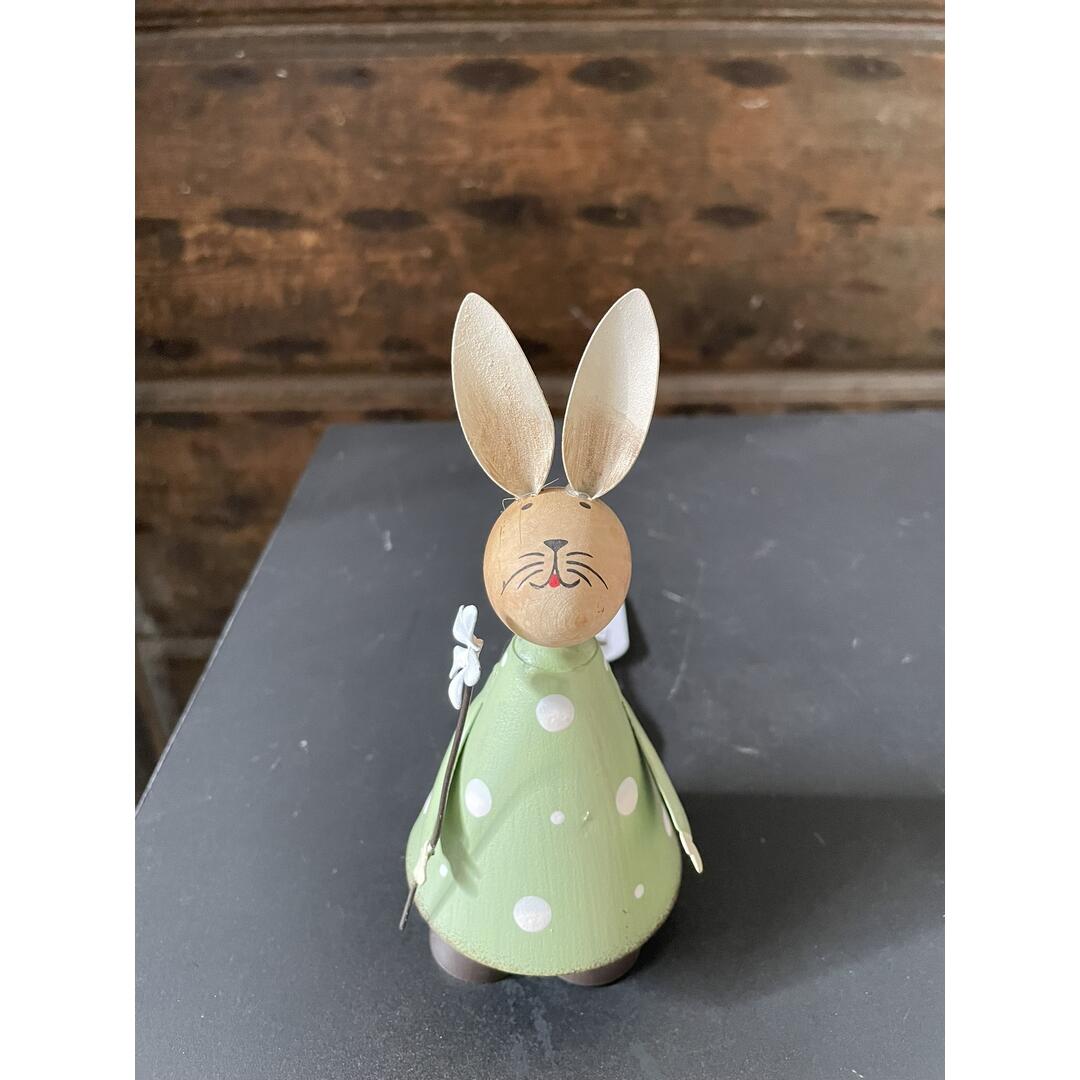 Coniglietto Nuvole di Stoffa piccolo in legno/metallo colore verde decoro pois con fiorellino in mano.