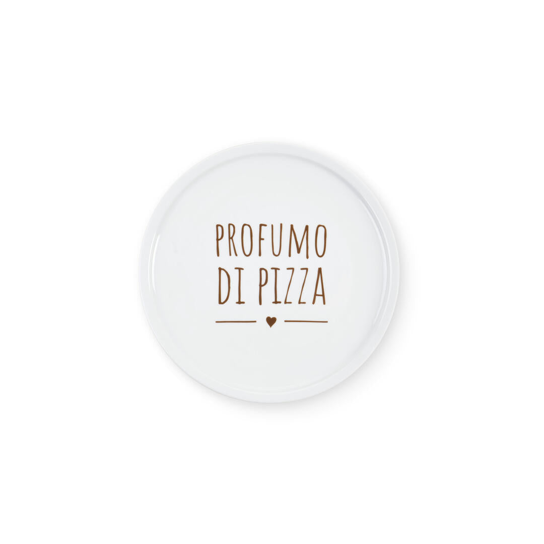 Coppia piatti pizza Nuvole di Stoffa in porcellana bone china colore bianco con scritta marrone "profumo di pizza".