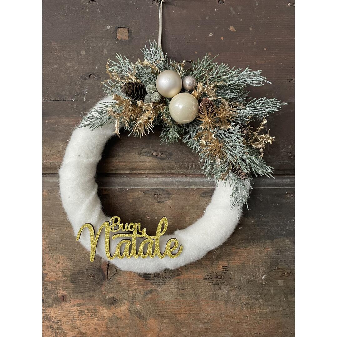 Corona fuoriporta natalizia ricoperta con lana naturale e completa decorazione con finto pino innevato, agrifoglio dorato, pignette, sfere in gradazione e scritta buon natale oro brillantinato.