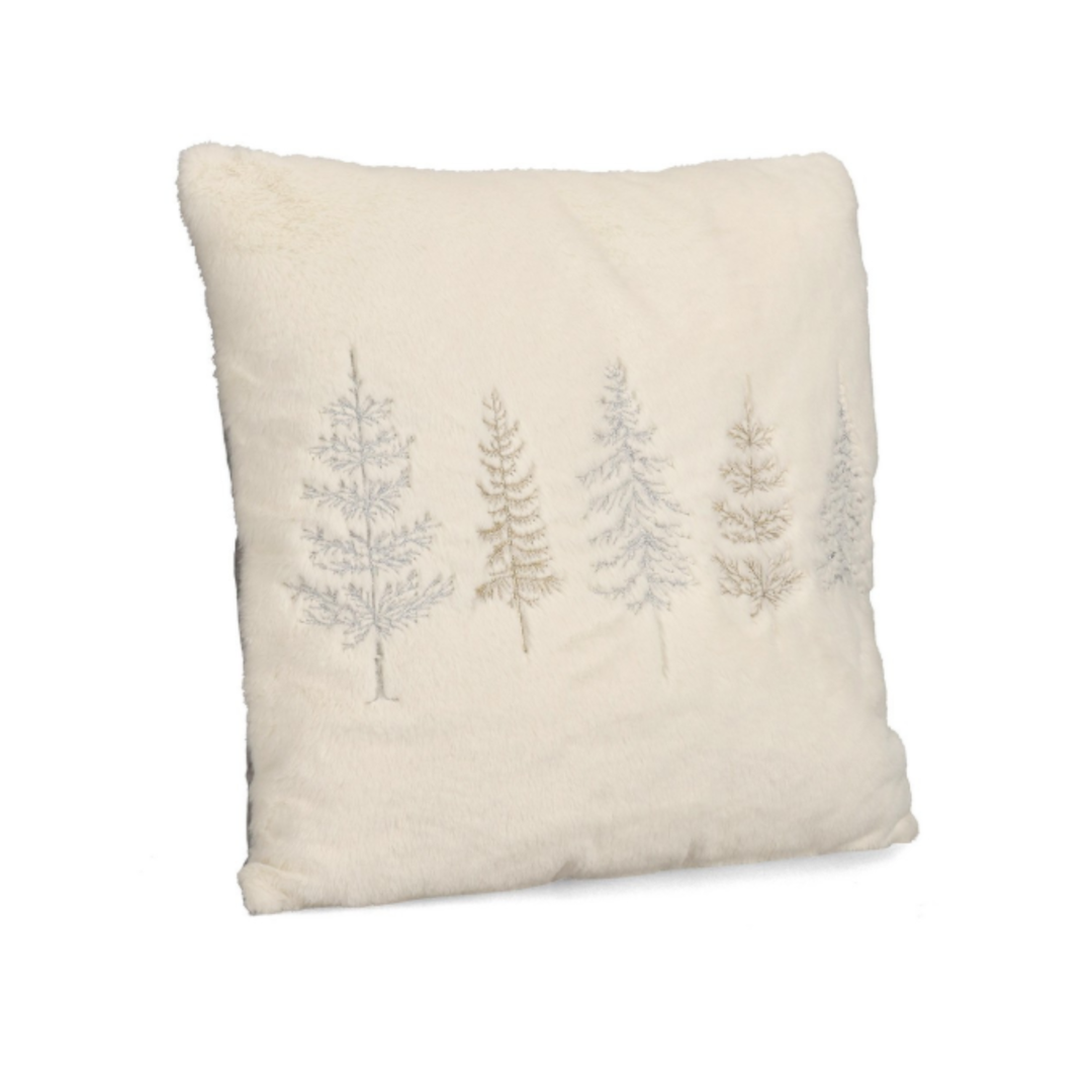 Cuscino Bizzotto Vallnord quadrato con fodera e imbottitura in poliestere, davanti effetto pelliccia sintetica colore bianco con elegante decoro alberi ricamato colori oro/silver, retro effetto velluto grigio.