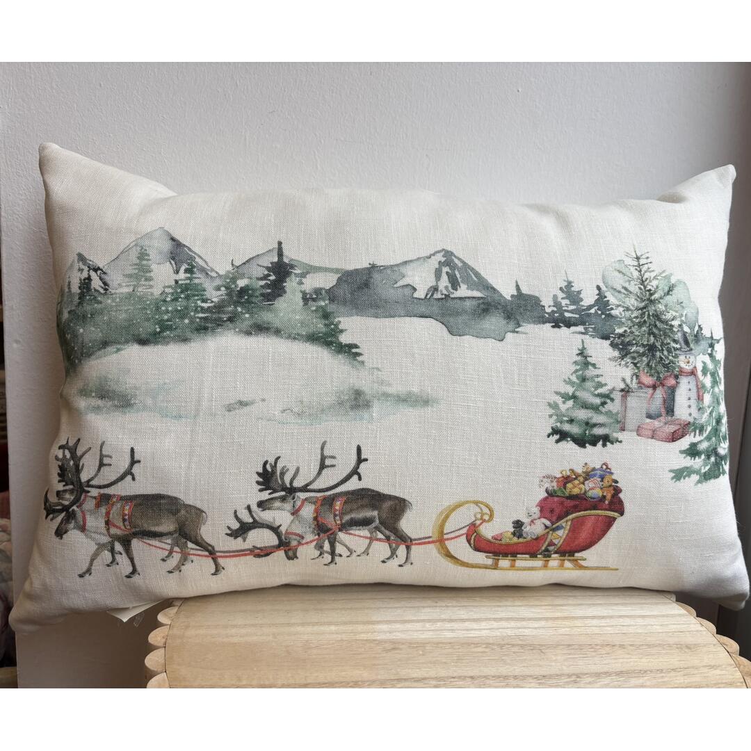 Cuscino rettangolare New Diffusion sfoderabile completo di imbottitura decoro slitta con doni trainata da renne, sfondo abeti e montagne.