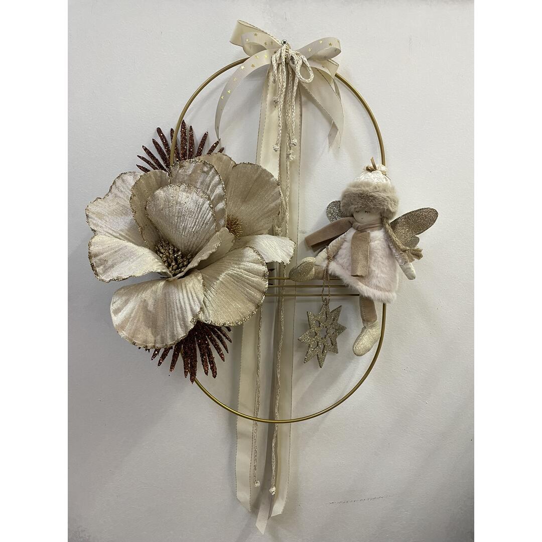 Furiporta ovale in metallo colore oro opaco con decorazione fiore colore champagne/oro/marron, angioletto con stella brillantinata e nastri pendenti in gradazione
