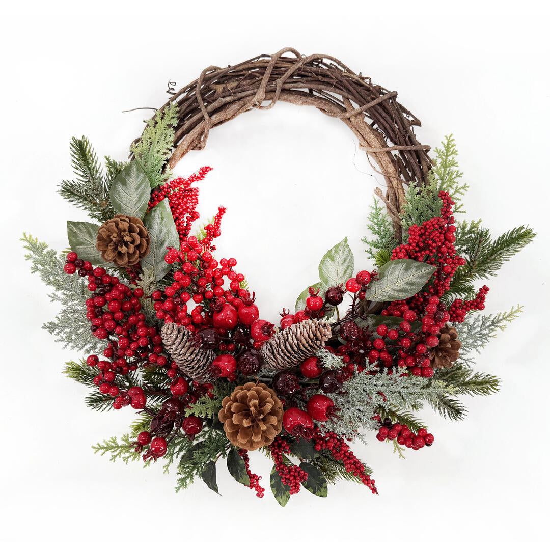 Ghirlanda fuoriporta Elle Gift in vimini colore marron naturale con decorazione bacche rosse, pigne e aghi di pino verdi.