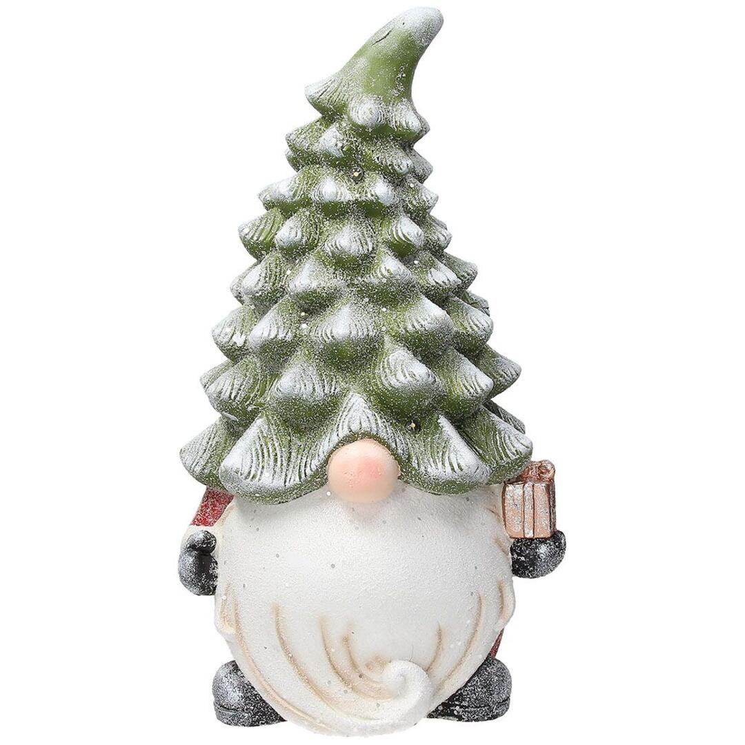 Gnomo Abete Andrea Fontebasso in ceramica colore bianco/rosso/verde con cappello effetto ghiacciato con led a batteria e pacchetto regalo in mano.