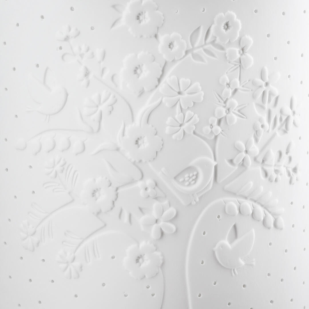 Lampada da tavolo Gilde forma ellisse in porcellana traforata finitura bianco opaco con decoro albero con uccellini