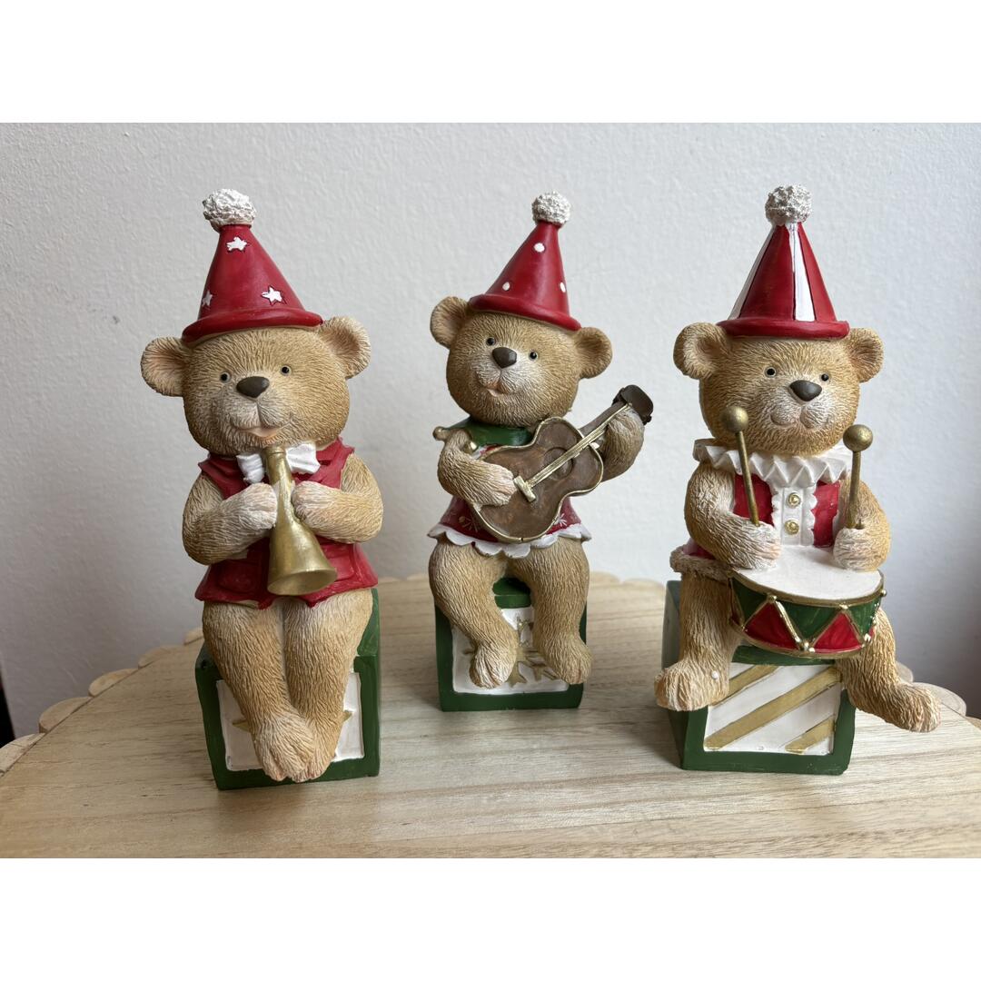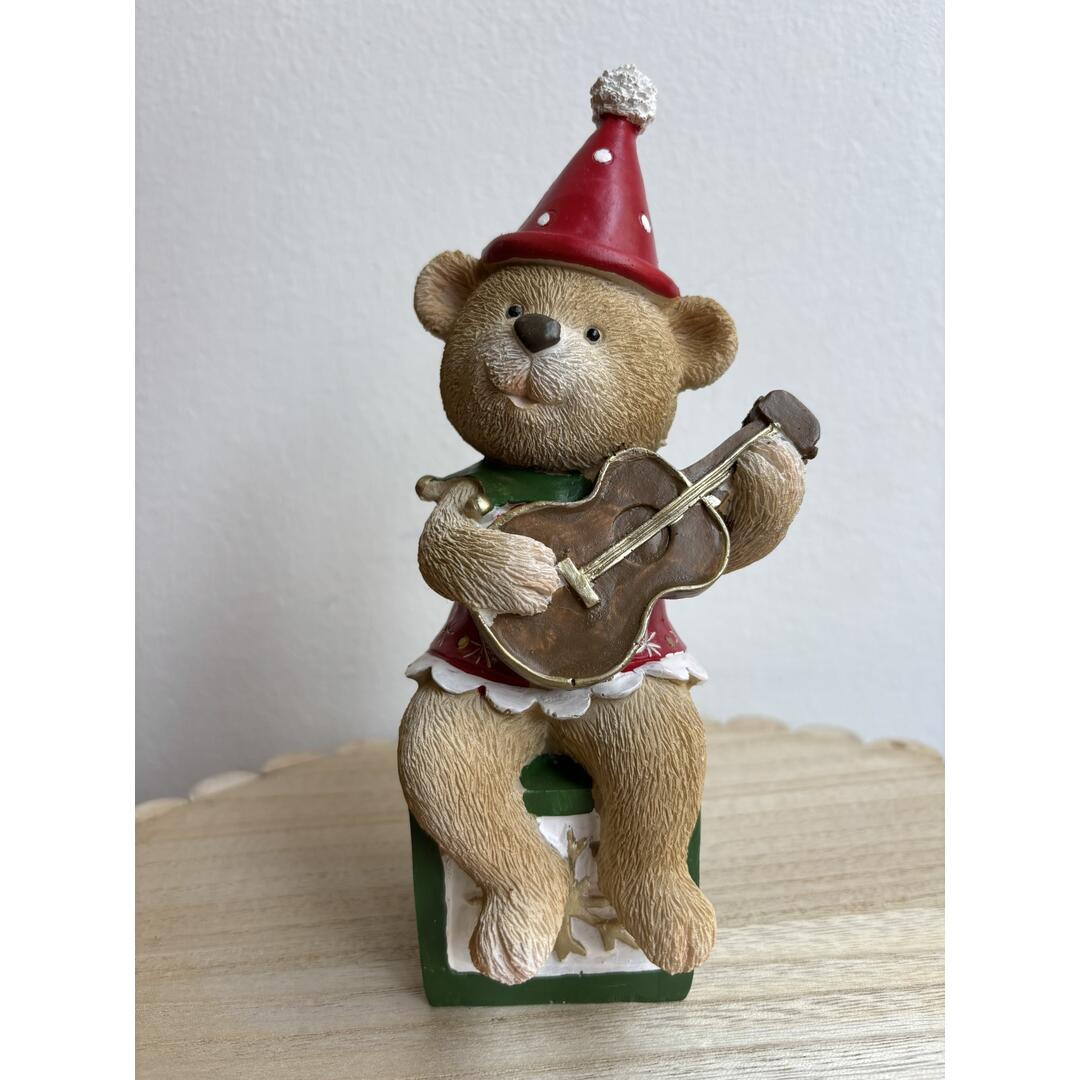 Orsetto Hervit seduto con chitarra, in poliresina colori beige/rosso/bianco/verde dipinto a mano.