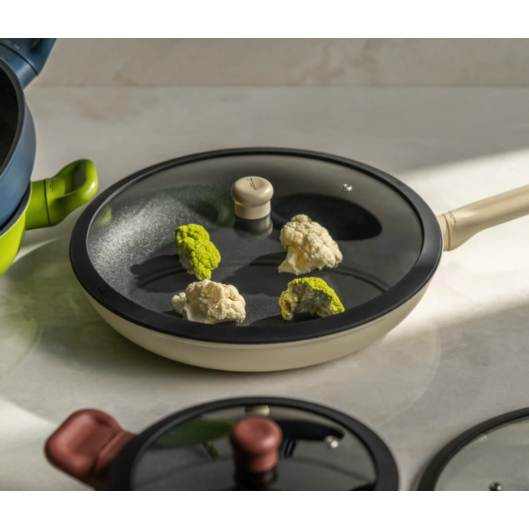 Padella Guzzini Cook&Color con corpo in alluminio riciclato e riciclabile forgiato ad alto spessore e sabbiato, con rivestimento antiaderente ruvido privo di PFAS che rende il prodotto resistente al graffio e all’abrasione, per una durata e un’antiaderenza eccellenti nel rispetto dell’ambiente e della salute delle persone.