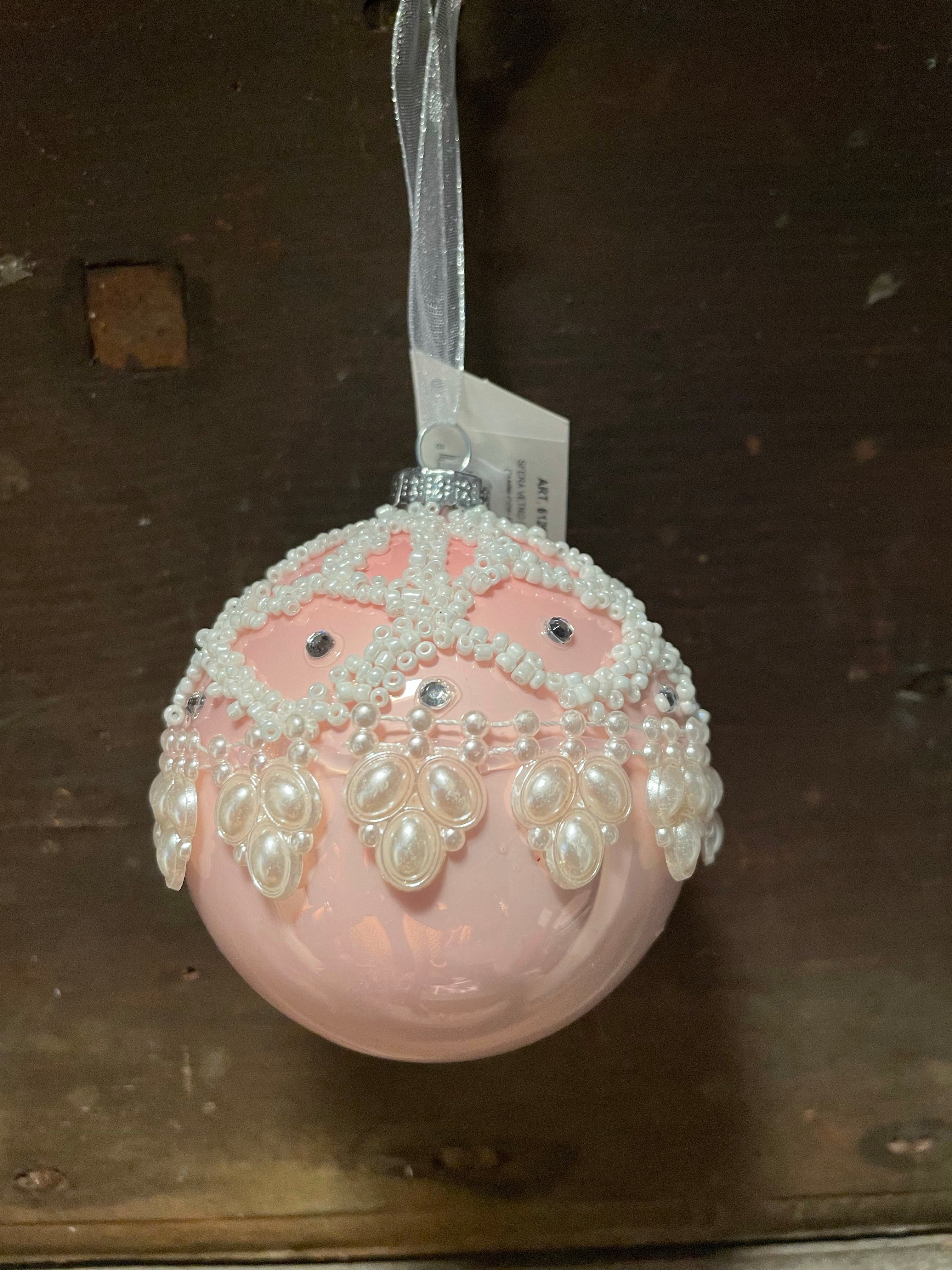Pallina Natale Vacchetti in vetro colore rosa chiaro con decoro perle bianche