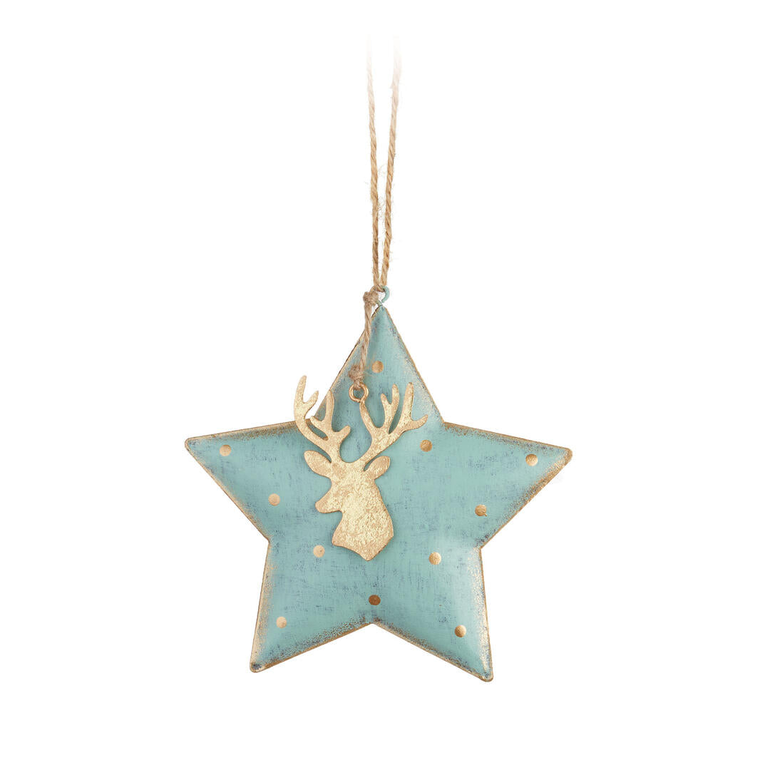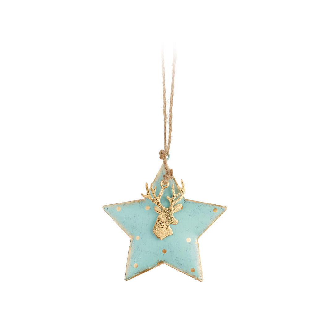 Pendente stella Oca Nera Splendida Festa in latta colori azzurro tiffany e dettagli oro con decoro cervo.