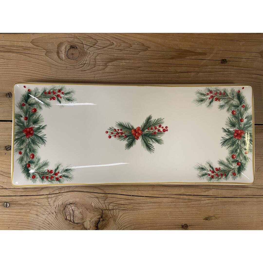 Piatto torrone Evviva Bacche rettangolare in porcellana bianca con decoro rosso/verde e bordino oro..
