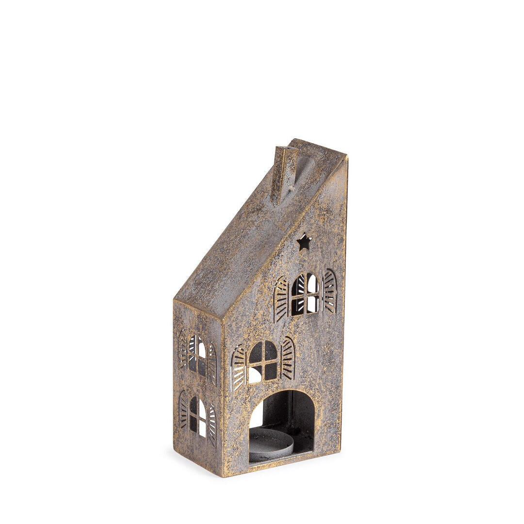 Porta candela Bizzotto casetta in metallo colore brunito effetto tipo anticato.