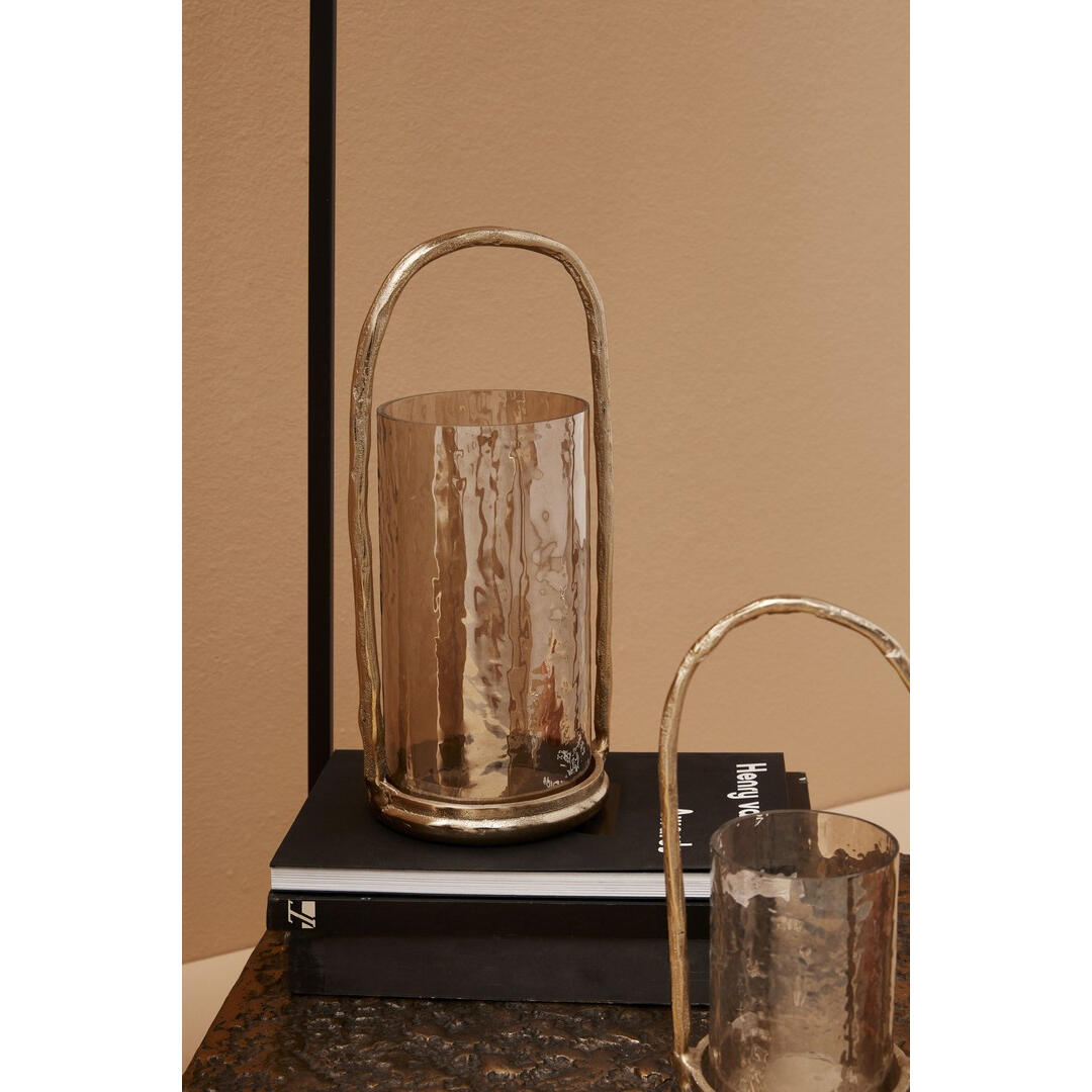 Porta candela Bizzotto Sagar metallo lavorato artigianalmente finitura oro spazzolato con manico stondato e bicchiere cilindrico in vetro trasparente.