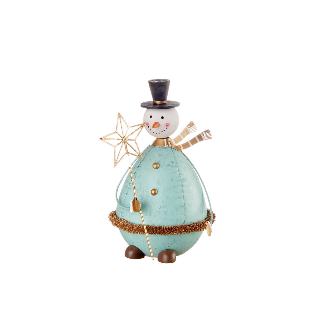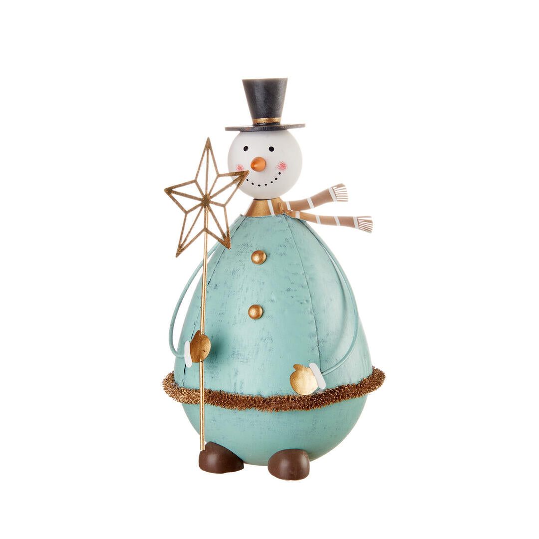 Pupazzo di neve Oca Nera Splendida Festa in latta colori azzurro tiffany e dettagli oro con cappello nero e stella in mano.