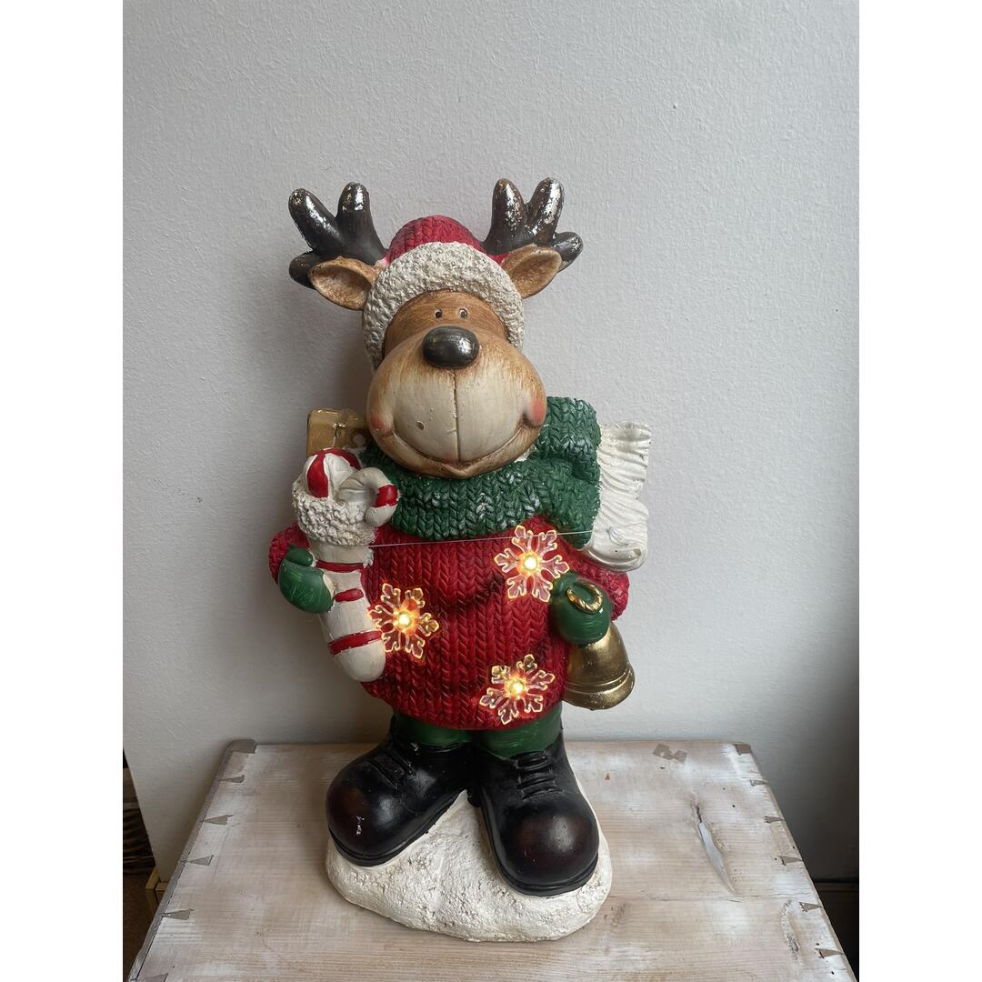 Pupazzo renna Elle Gift in ceramica colori rosso/marrone/verde con calza in mano e decoro fiocchi di neve con led a batteria.