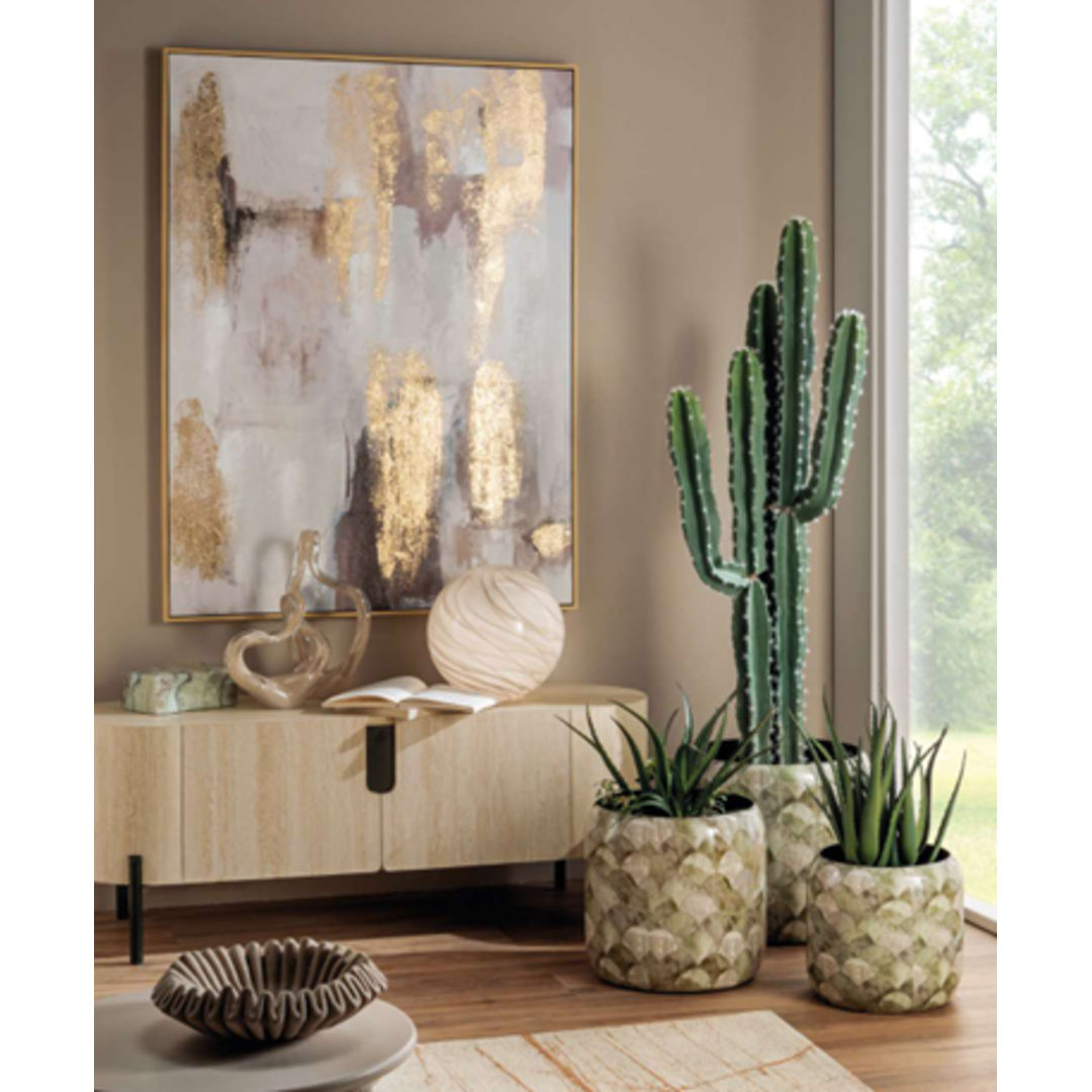 Quadro stampa Oca Nera decoro astratto effetto pennellato, nelle gradazioni del marron/tortora/bianco/grigio con eleganti dettagli dorati completo di cornice in legno effetto naturale.