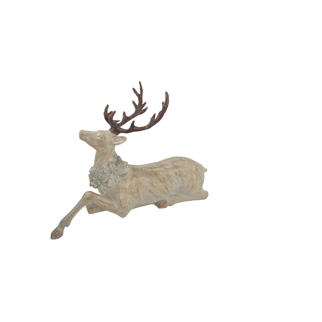 Renna seduta Elle Gift in poliresina finitura beige con corna marron e collare floreale