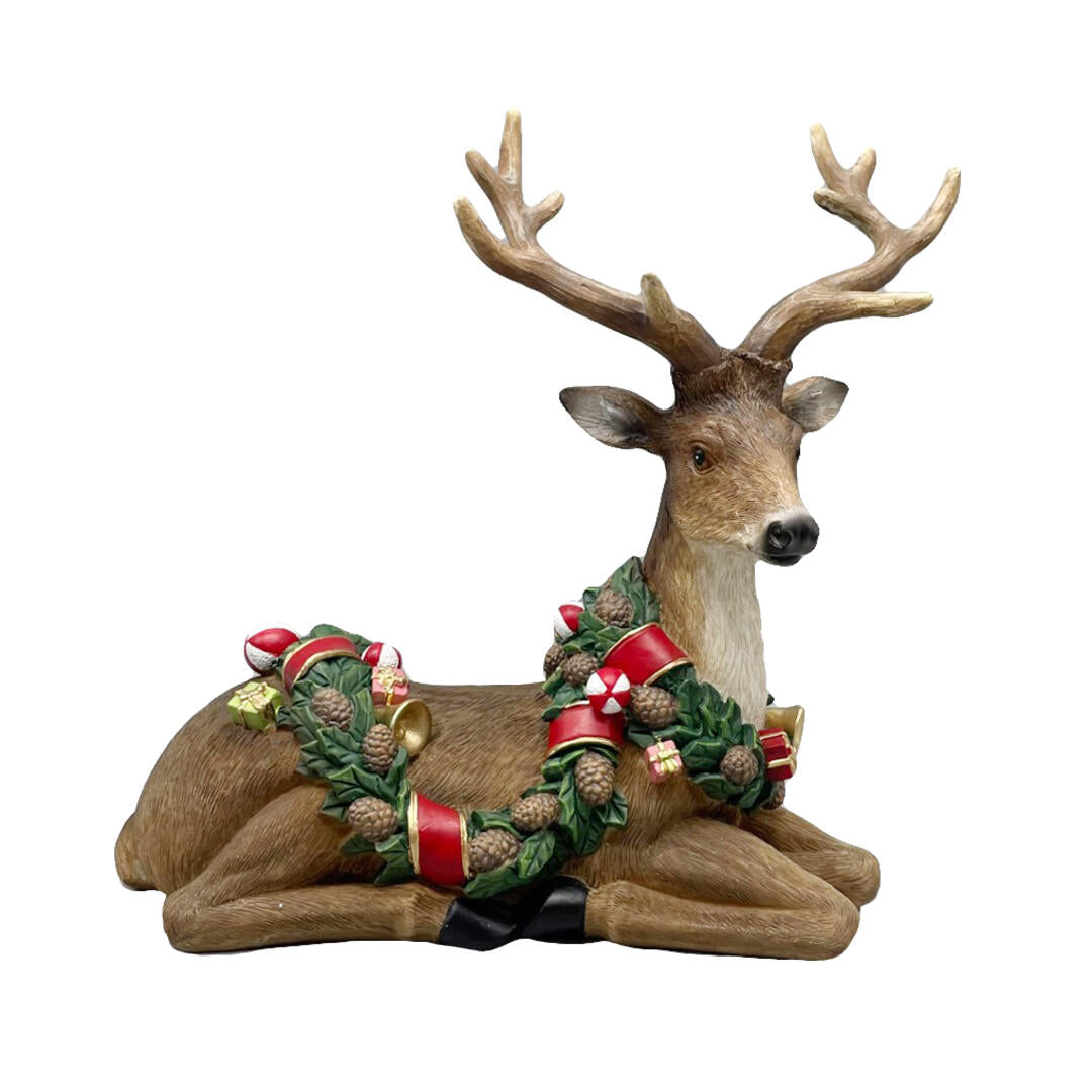 Renna in piedi c/ghirlanda di Natale Elle Gift in poliresina colori marrone/verde/rosso con dettagli dorati.